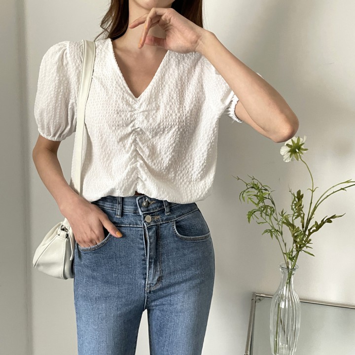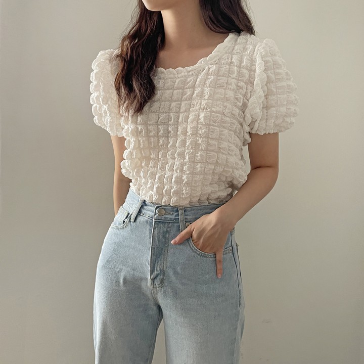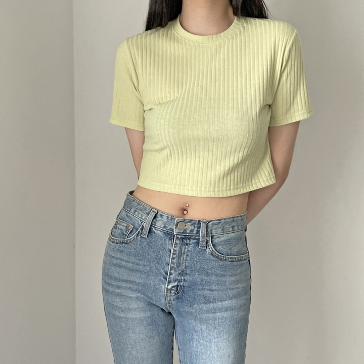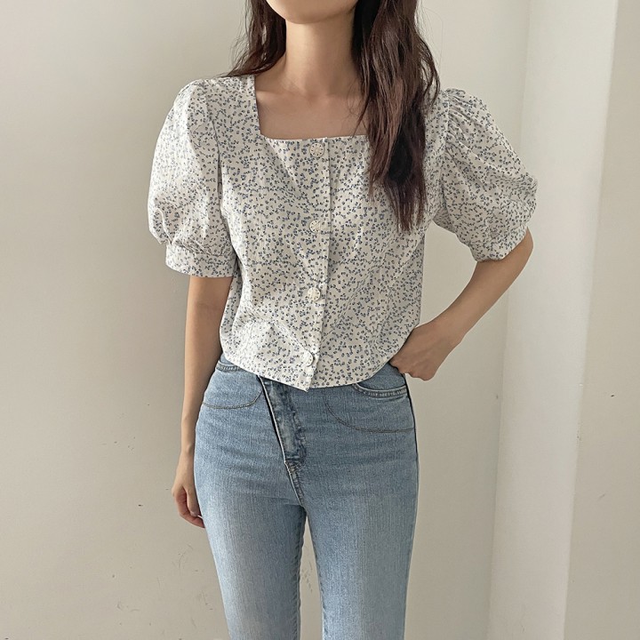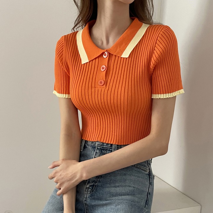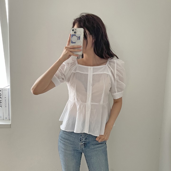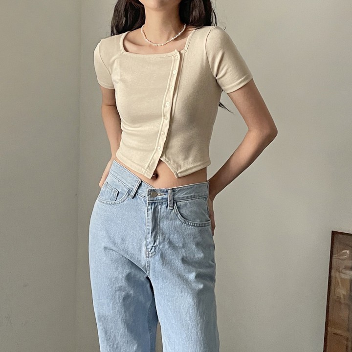 스퀘어넥 사선단추 슬림 반팔티셔츠