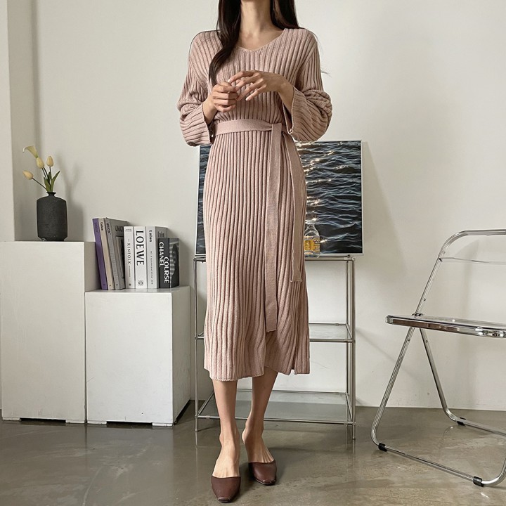 데일리 브이넥 골지 벨트 롱 원피스