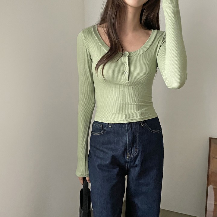 골지 버튼 유넥 슬림 티셔츠