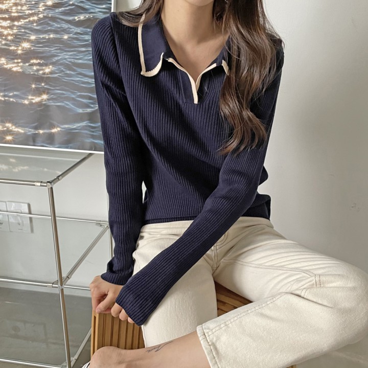 카라 배색 골지 긴팔 티셔츠