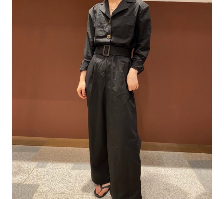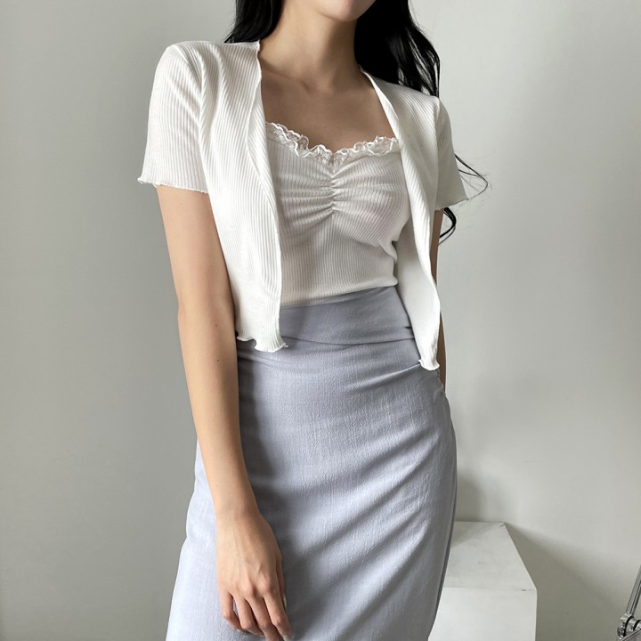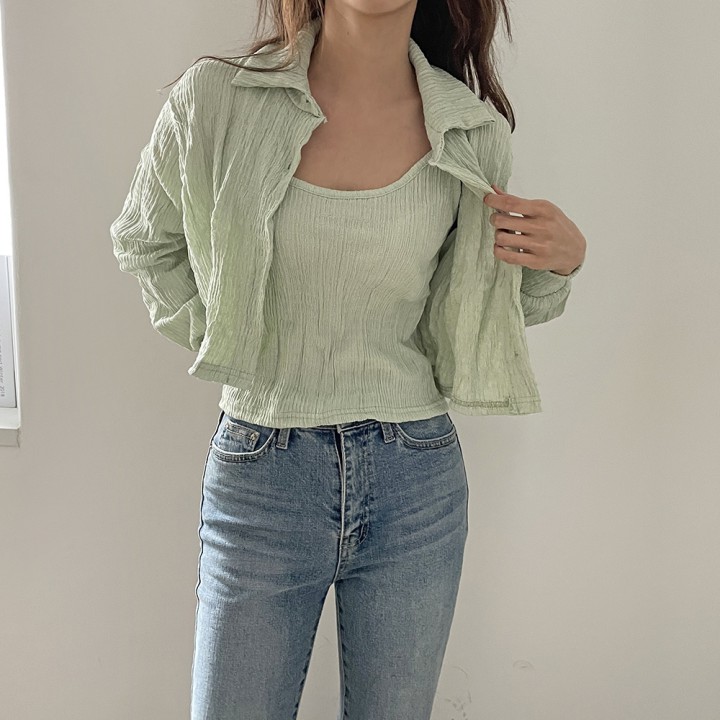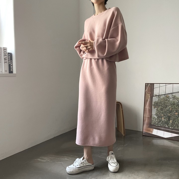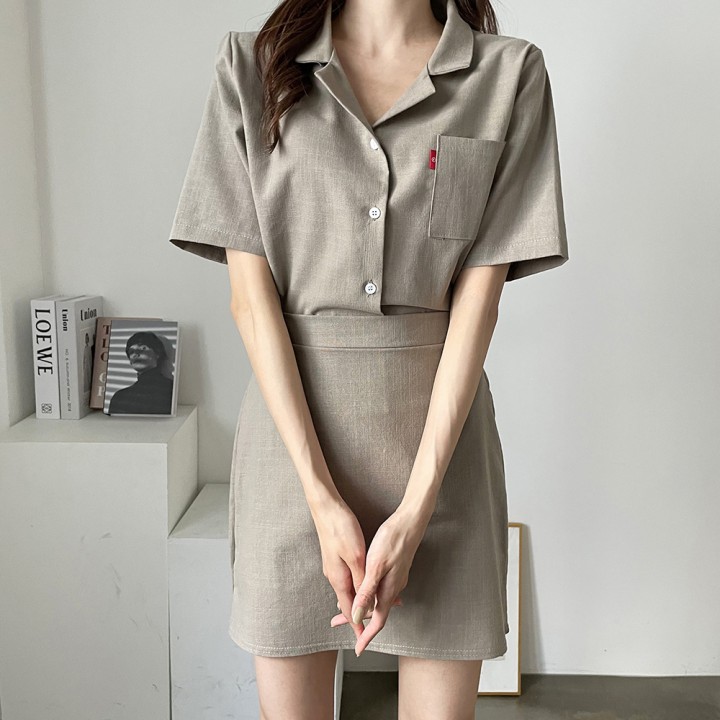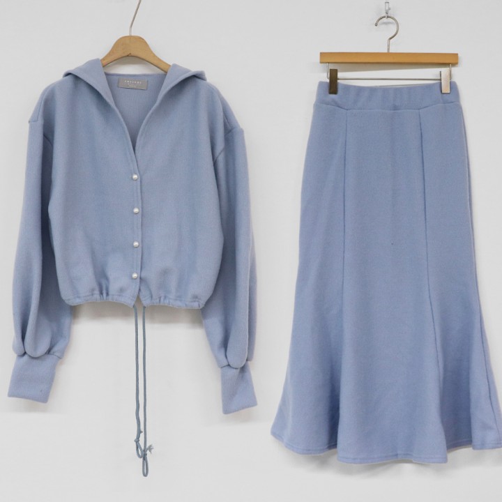 크롭 빅카라 블라우스 + 트임 롱스커트 투피스 세트