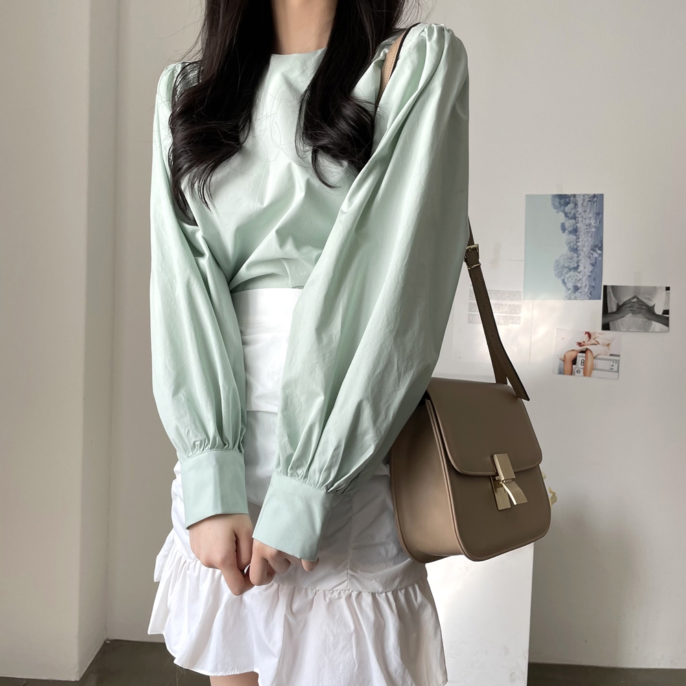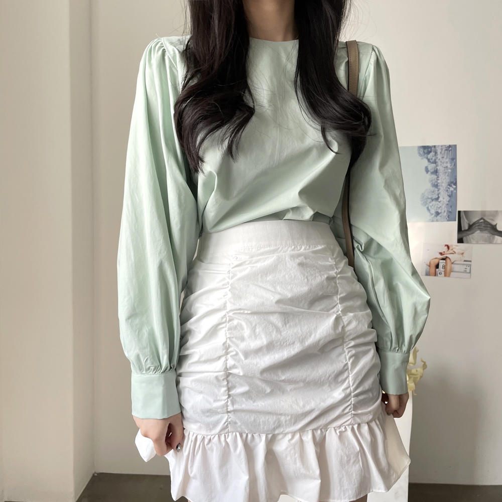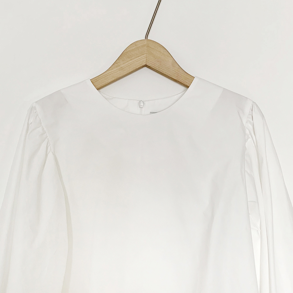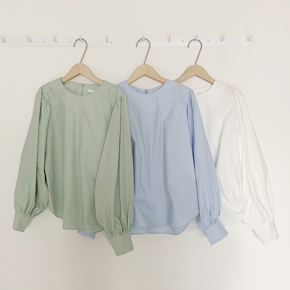 심플 무지 라운드 퍼프소매 블라우스