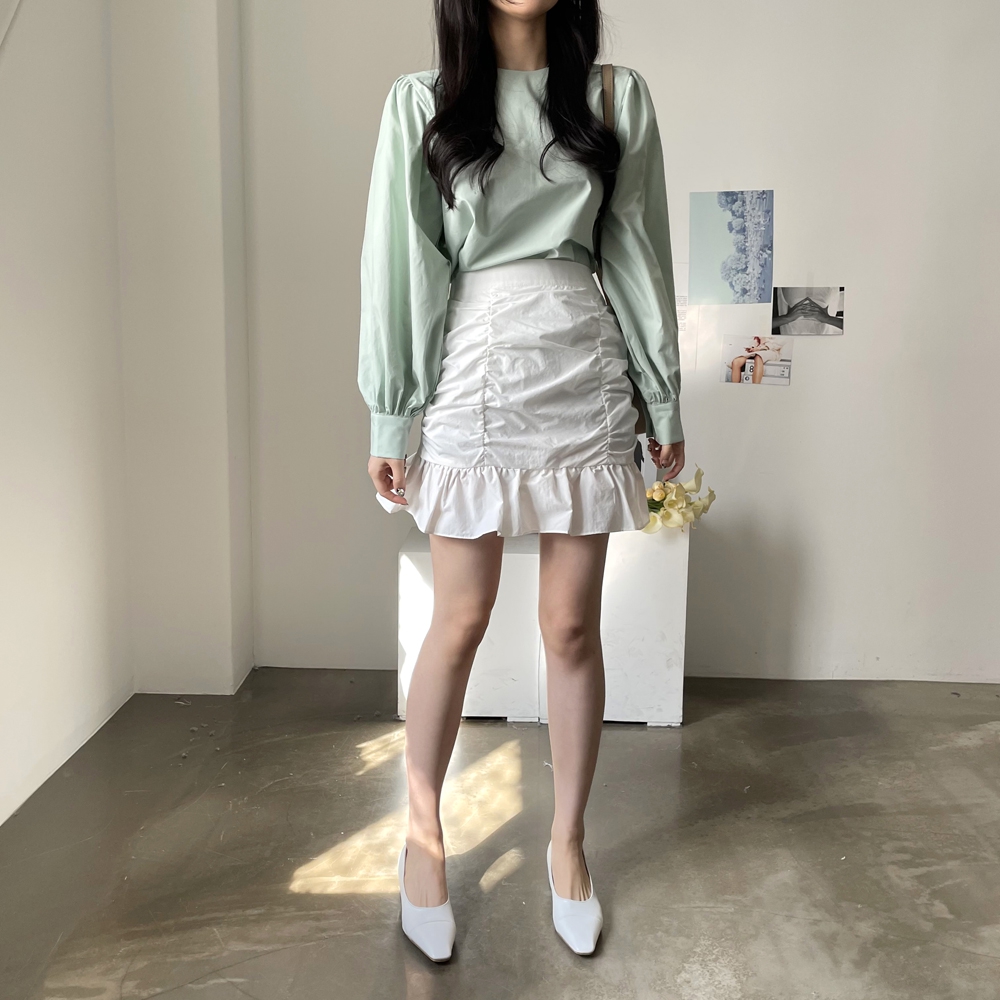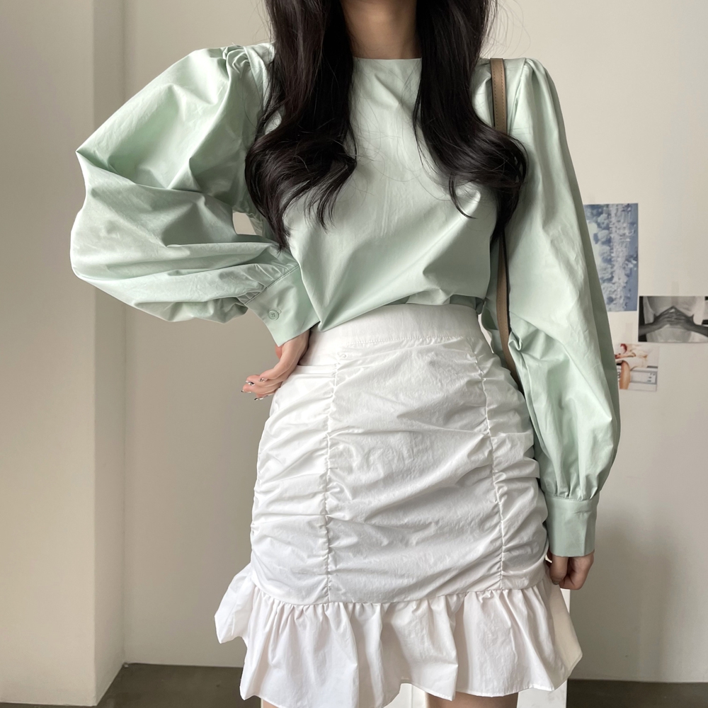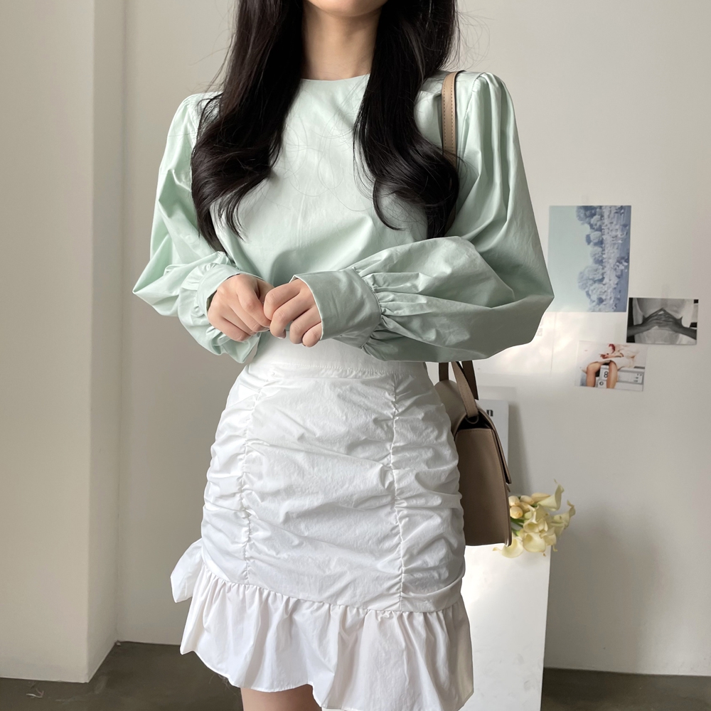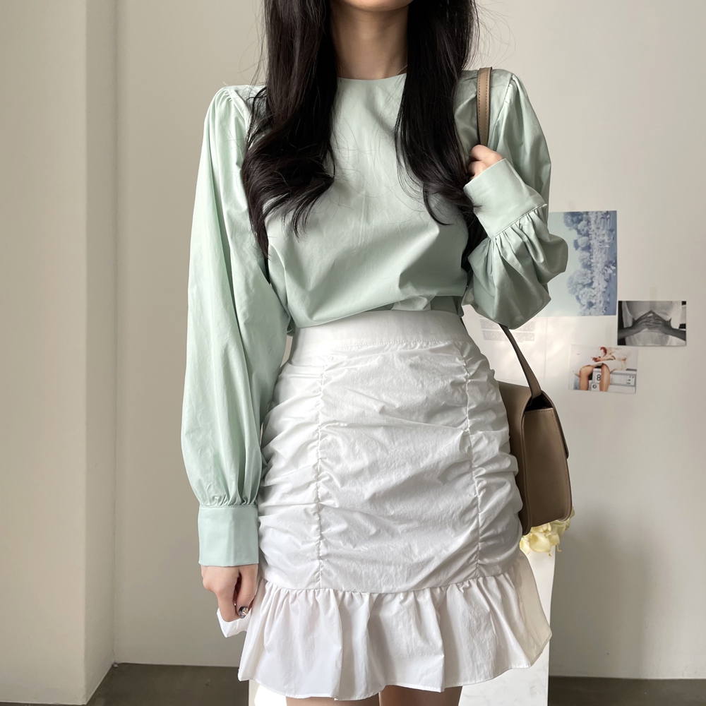 심플 무지 라운드 퍼프소매 블라우스