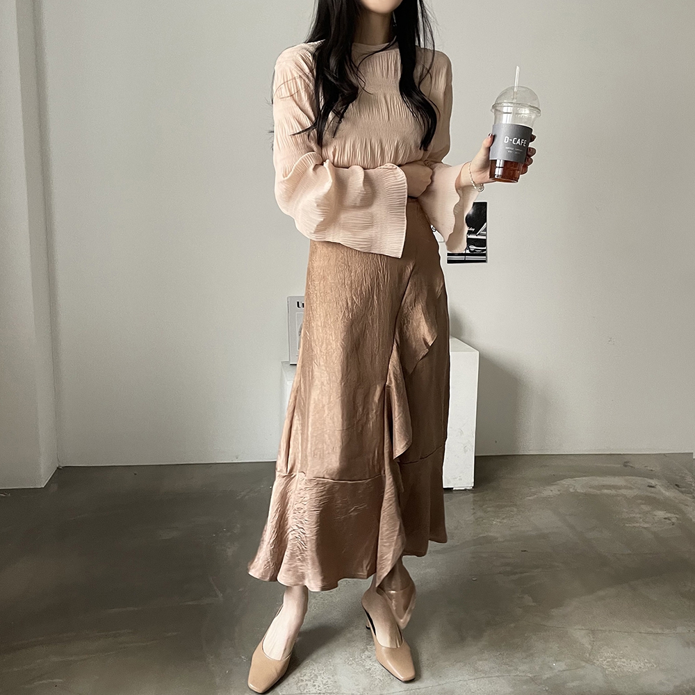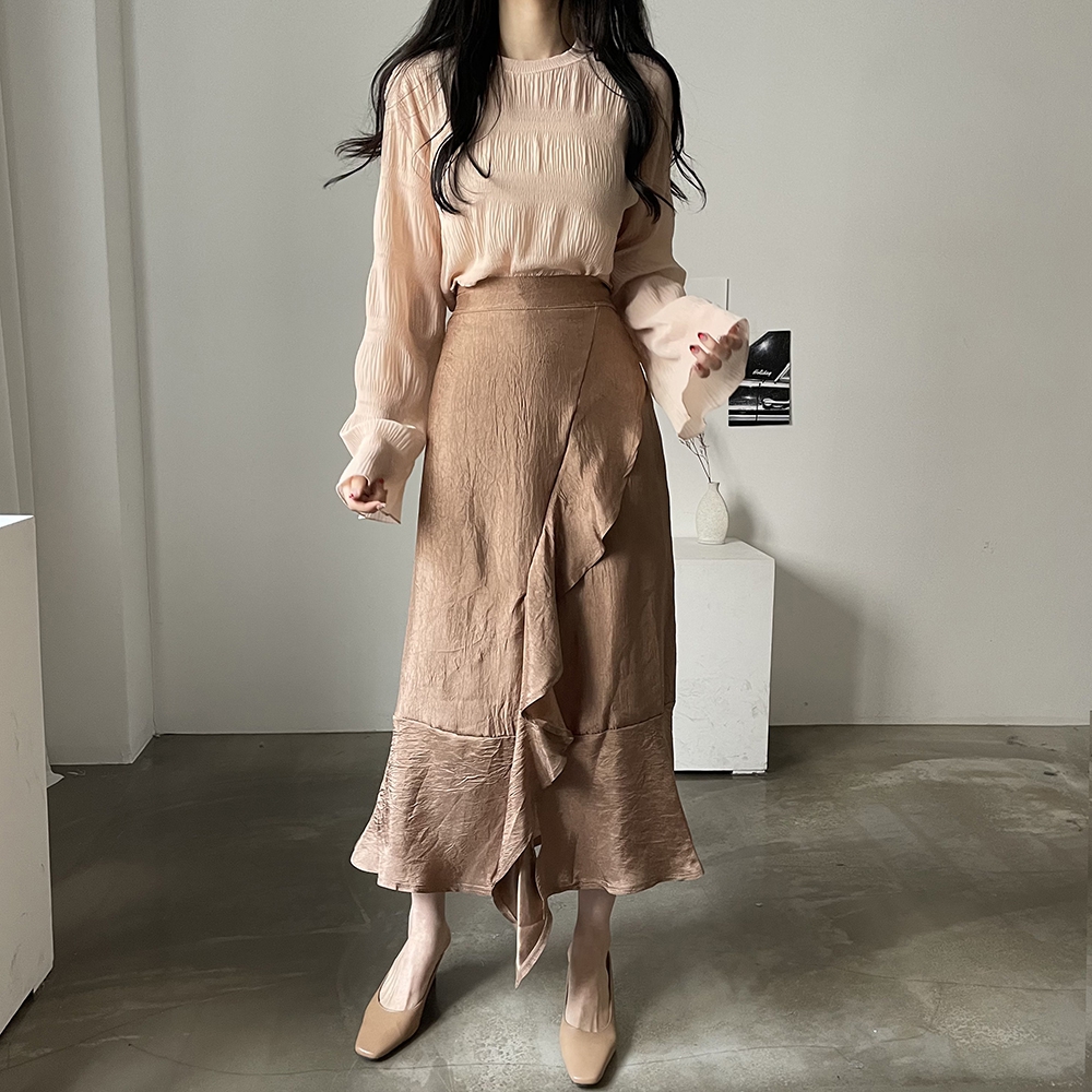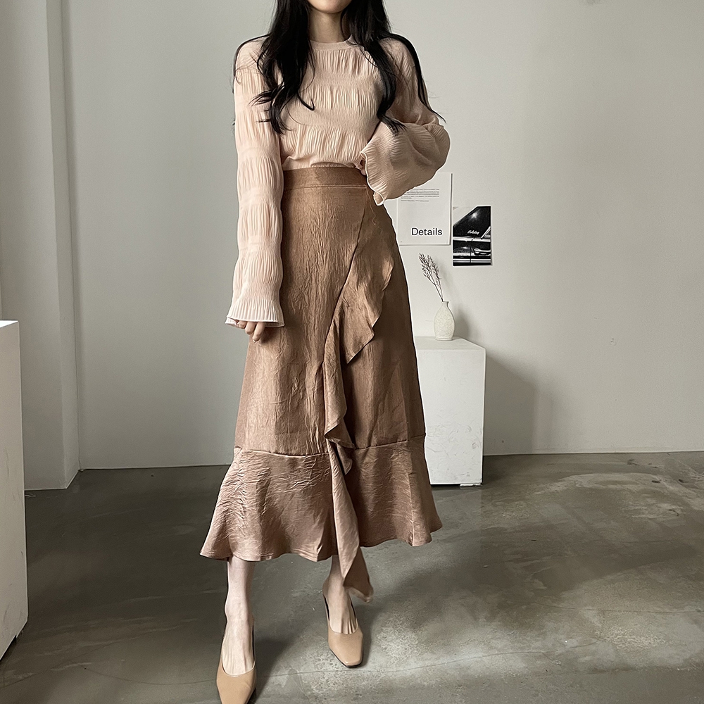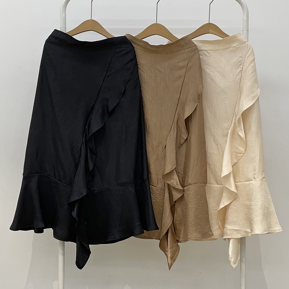 은은한 광택감이 우아한 샤틴 프릴 롱스커트에요.