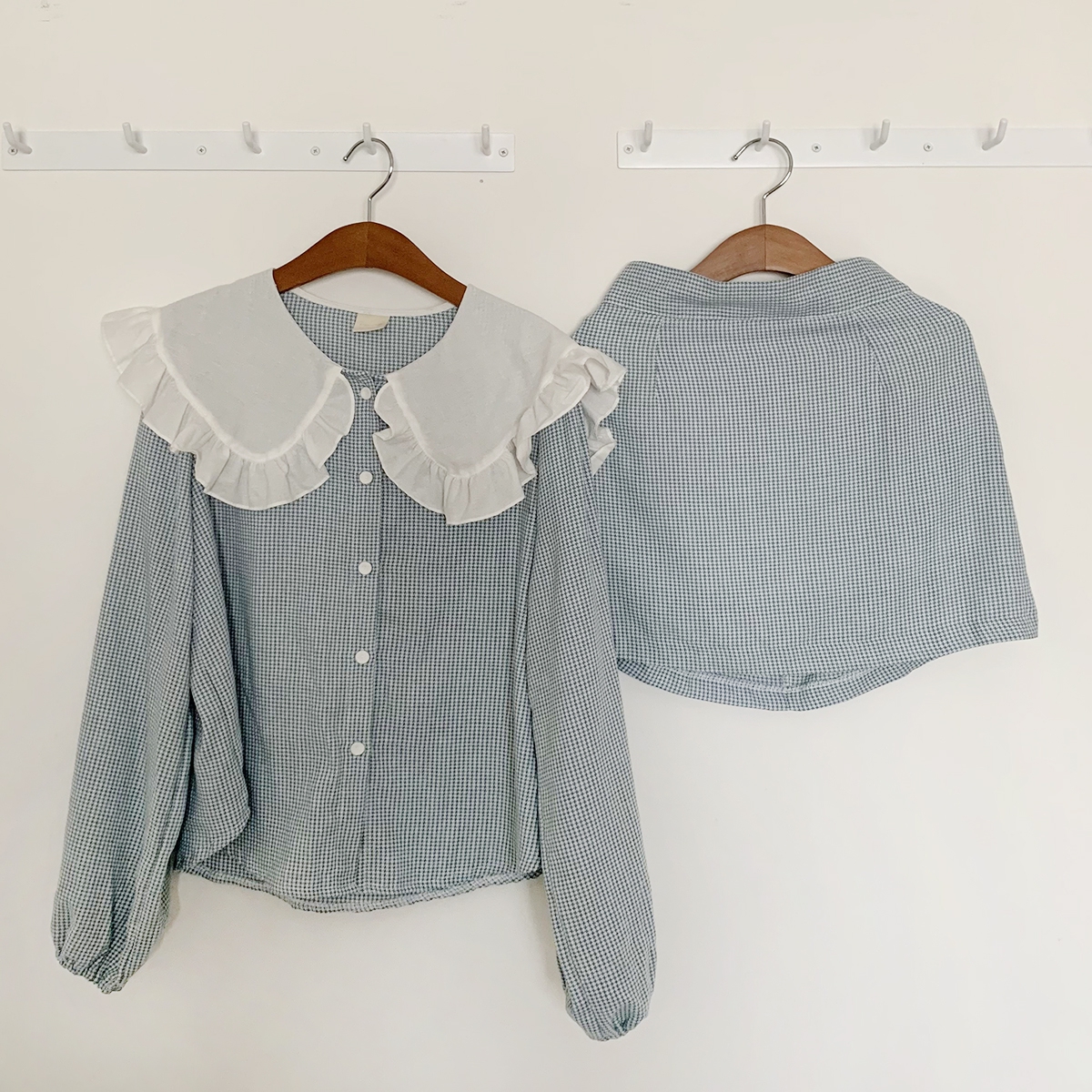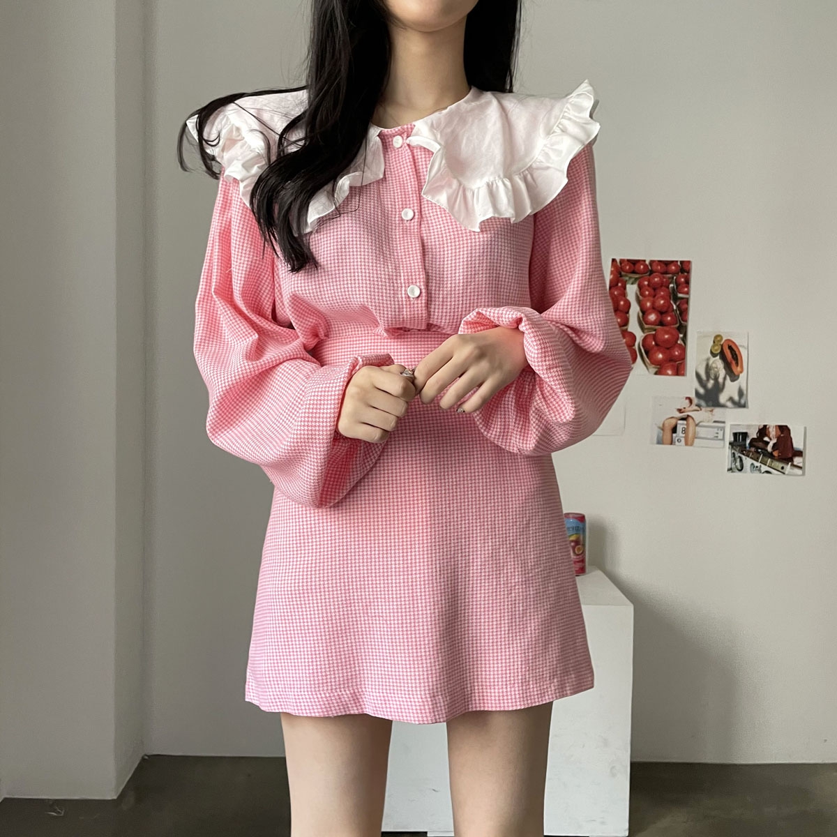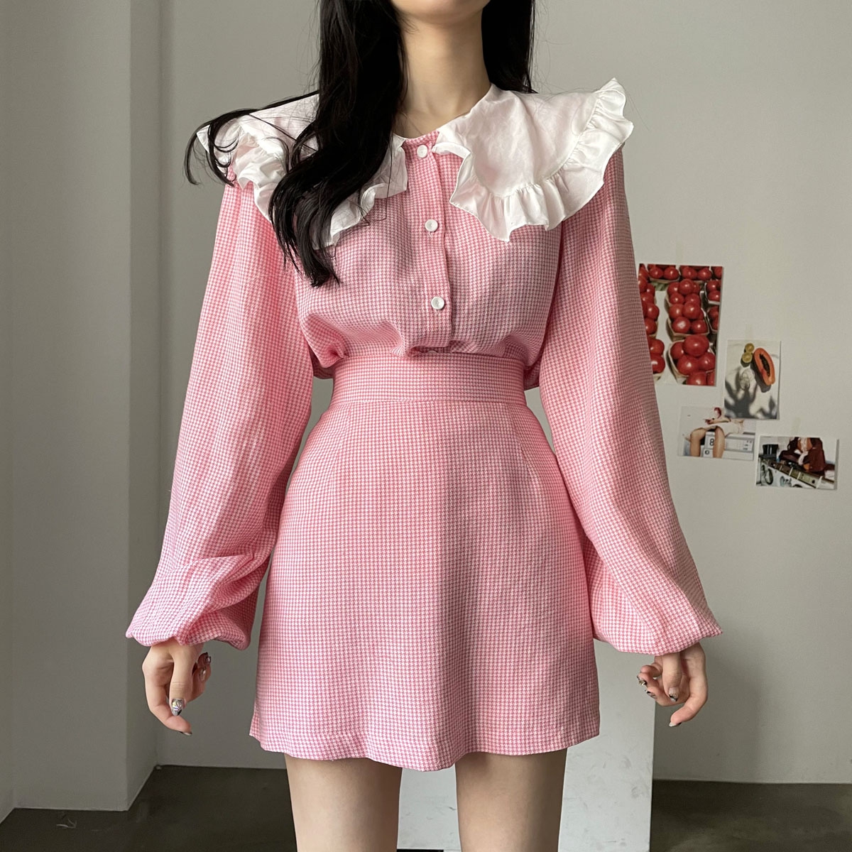 프릴과 벌룸소매로 귀여움을 더했으며,