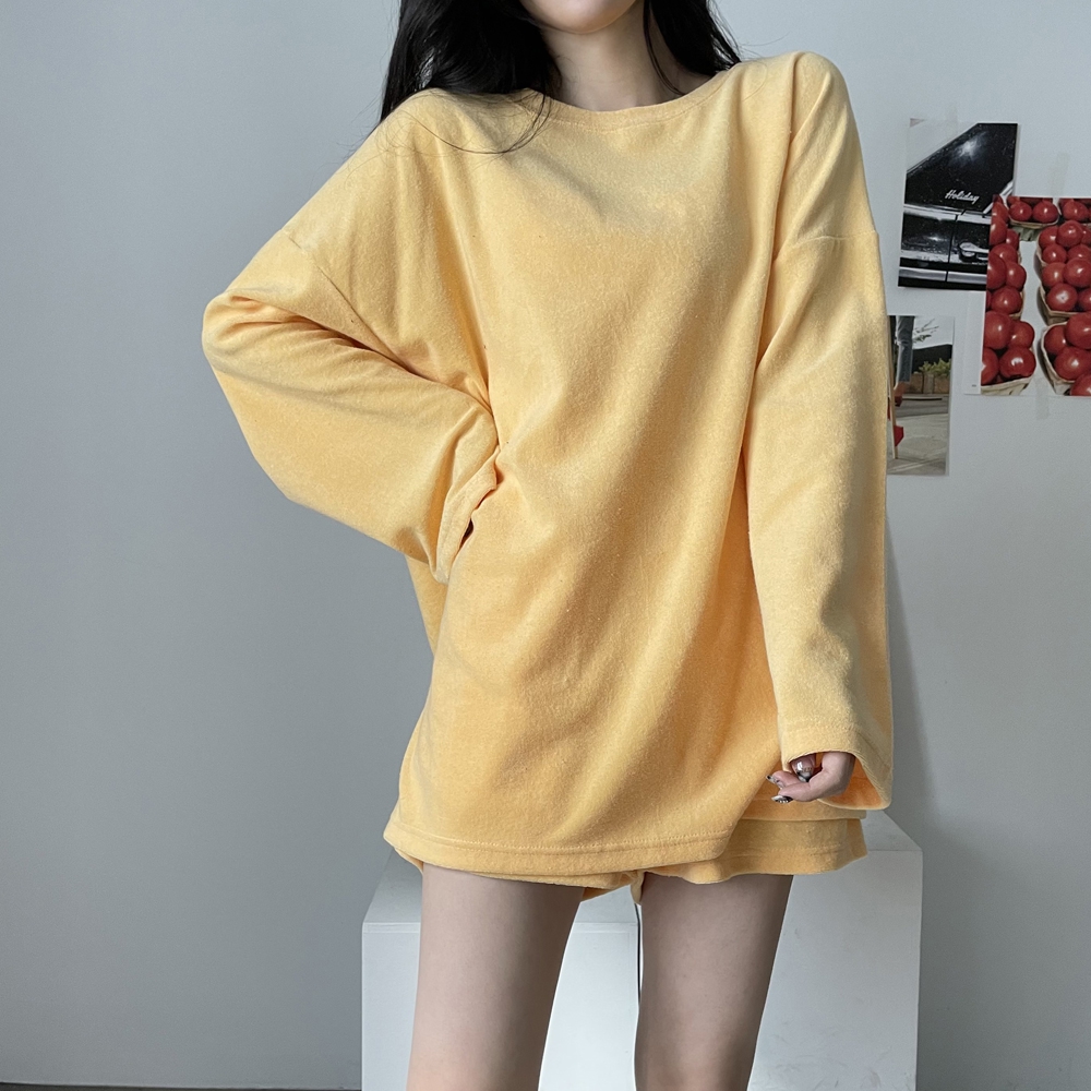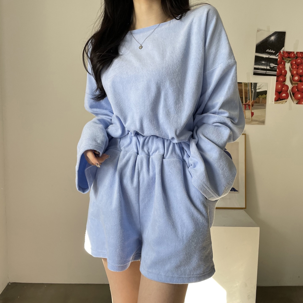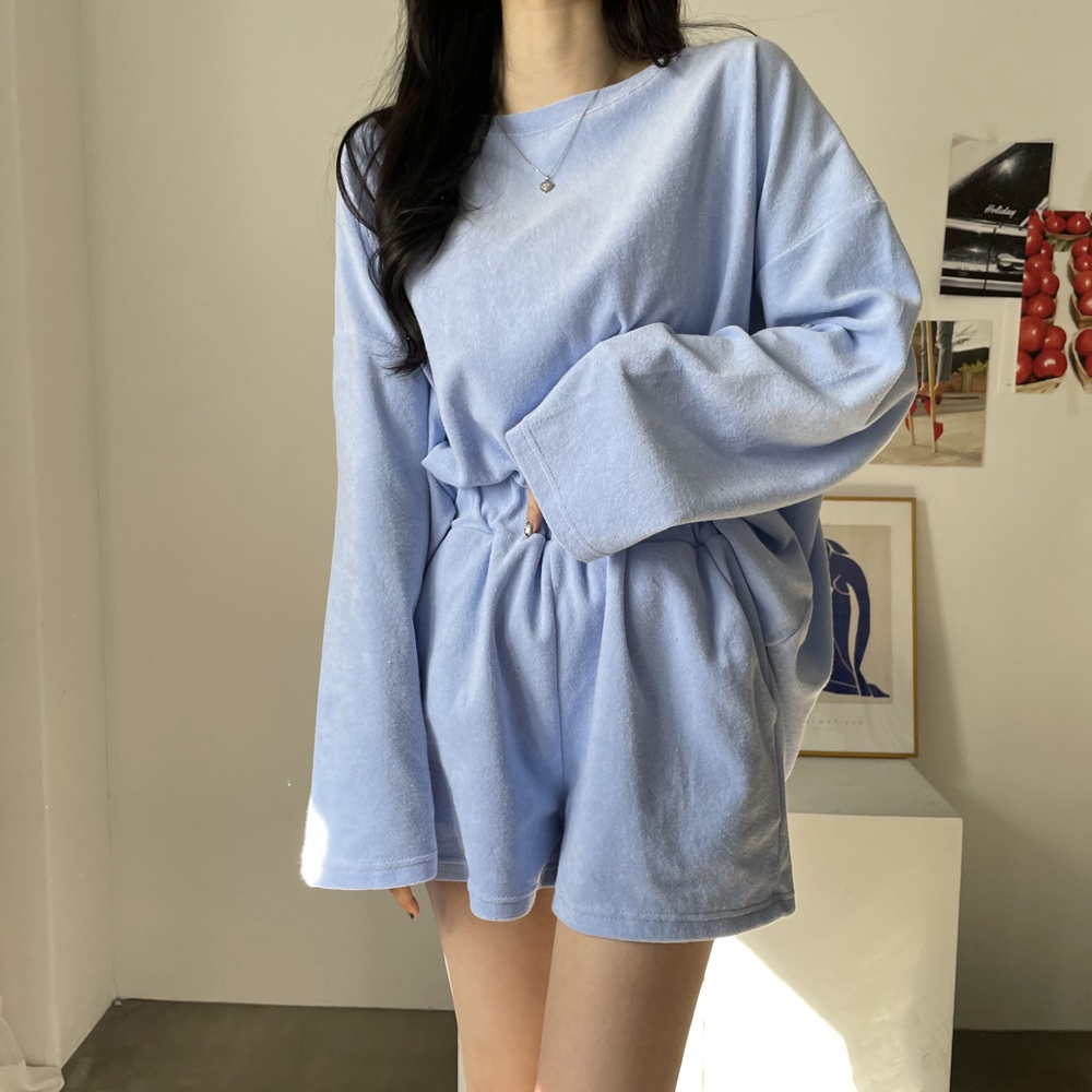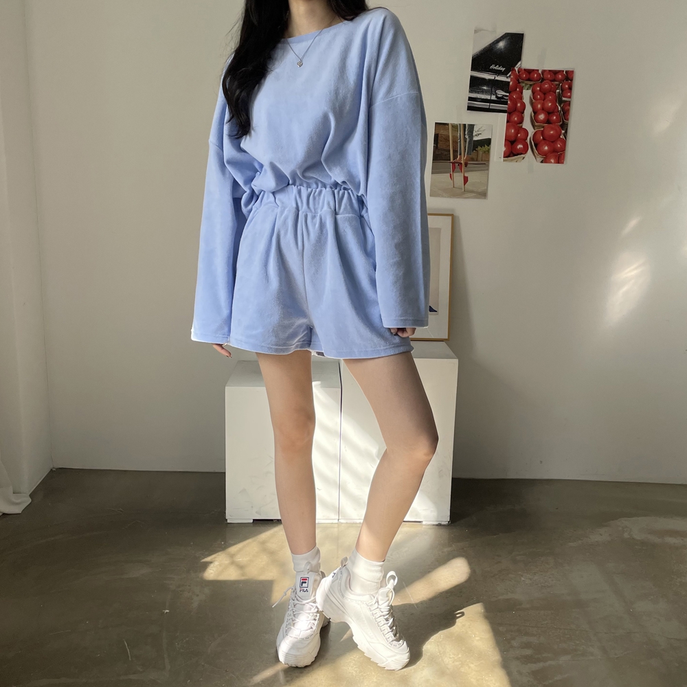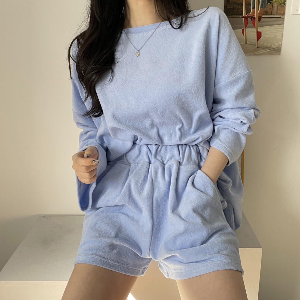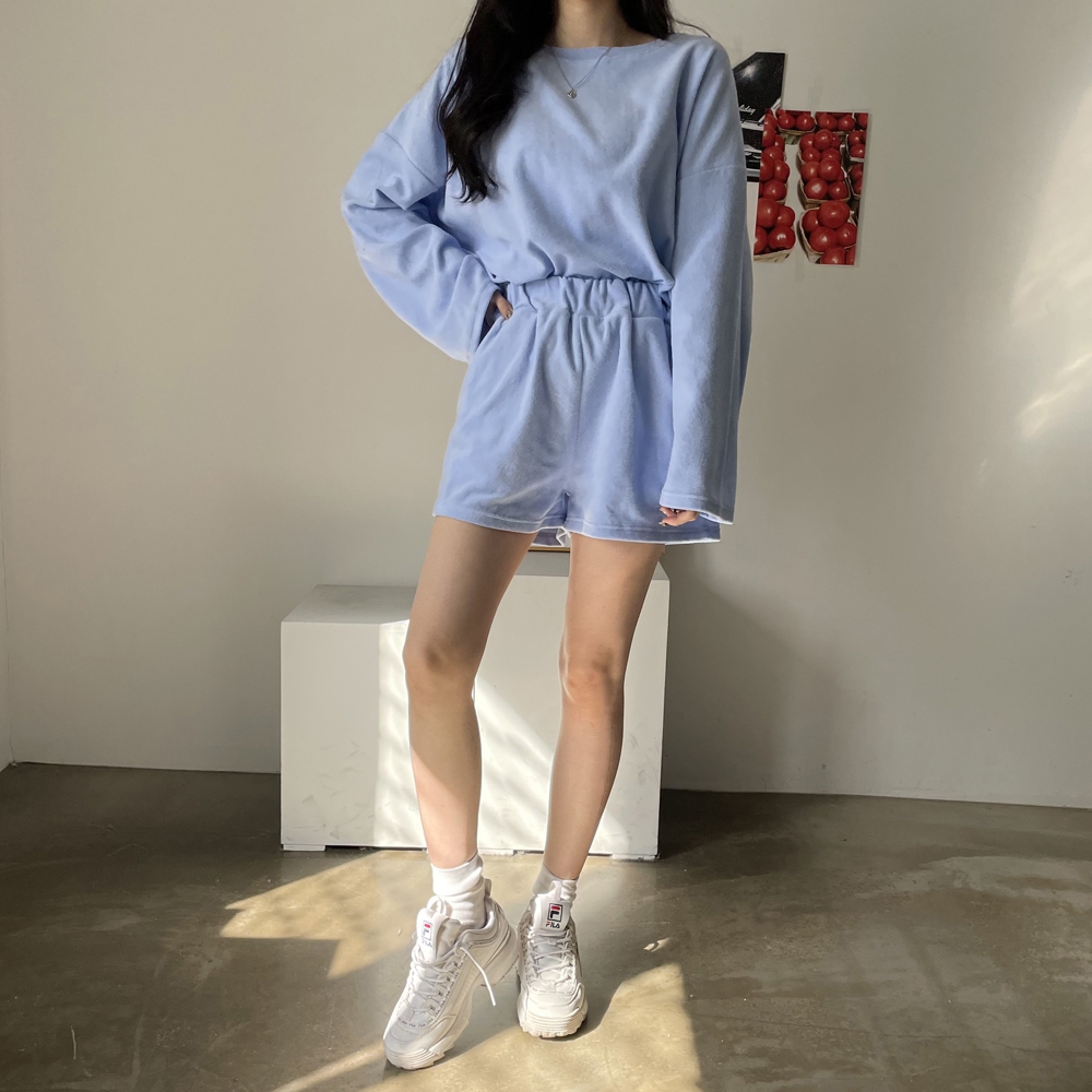 - [홈웨어] 뽀송 타올 맨투맨 반바지 트레이닝 세트