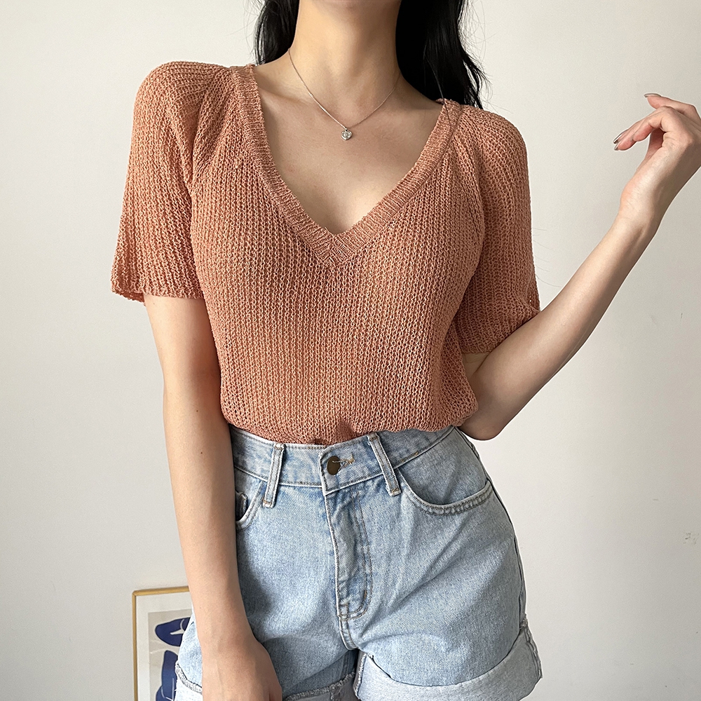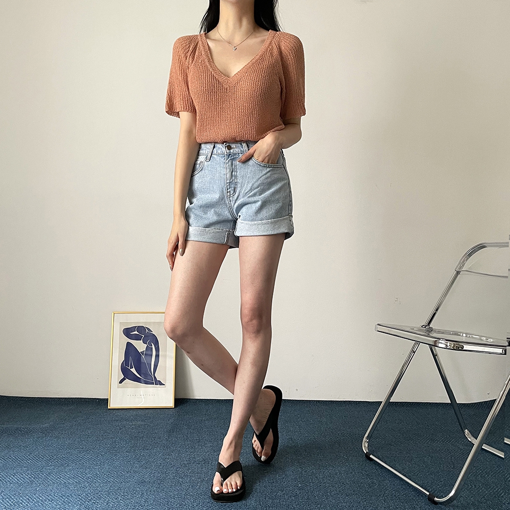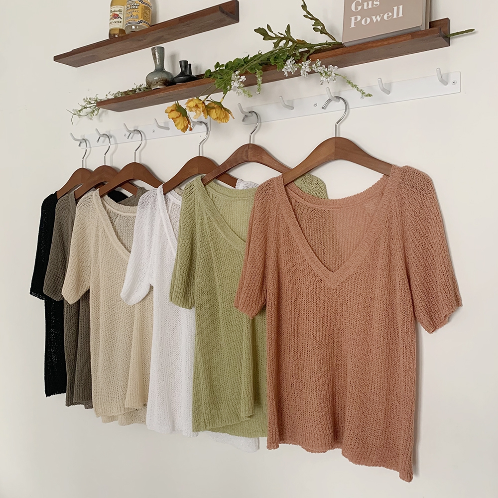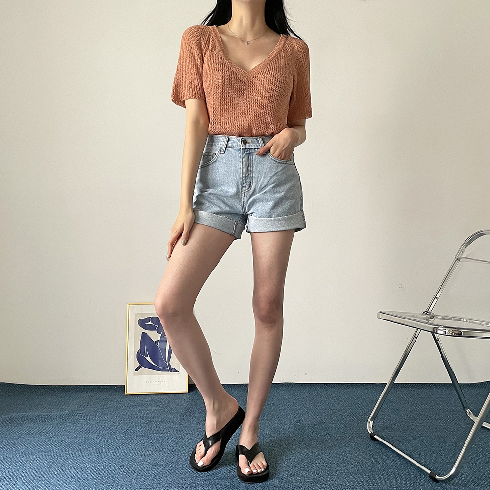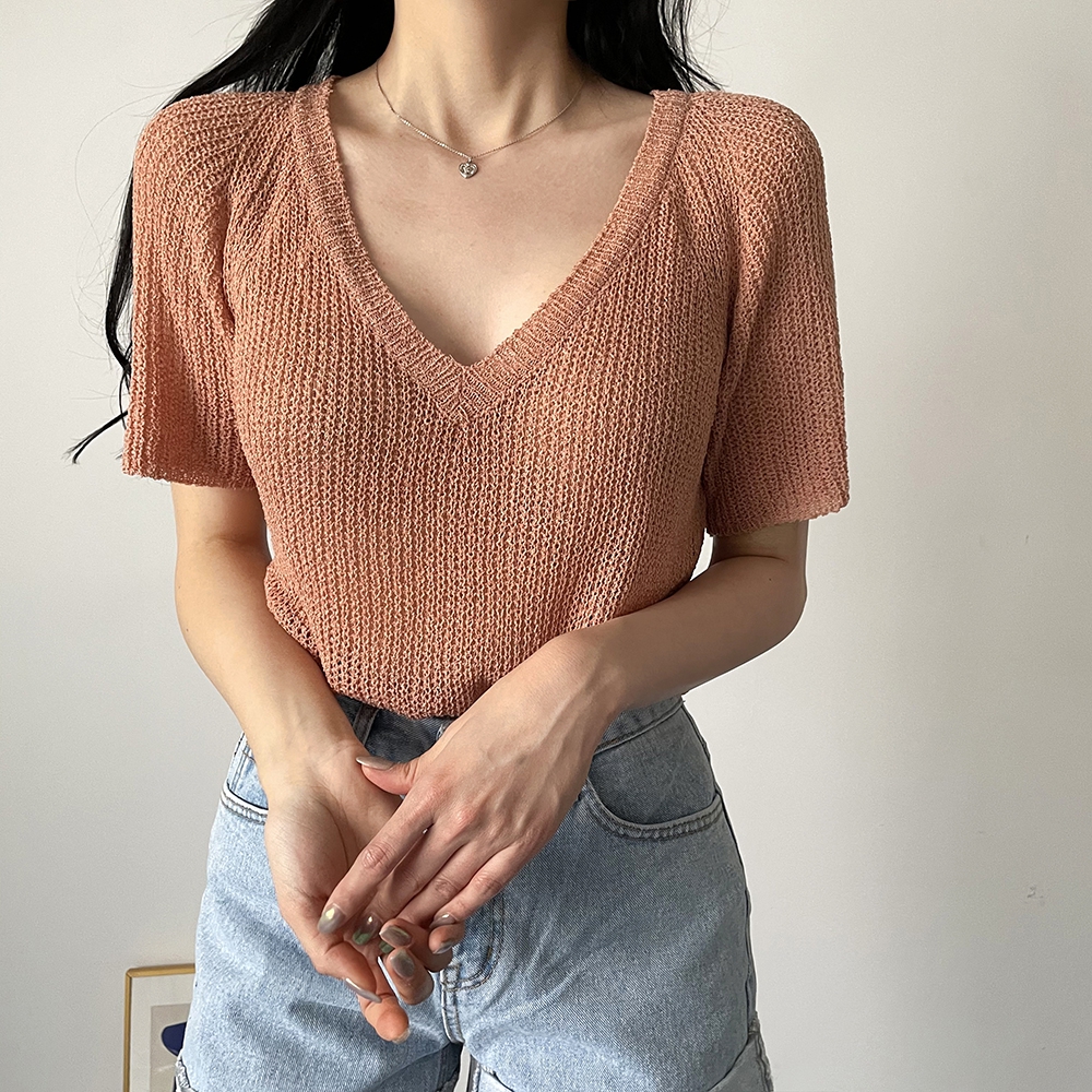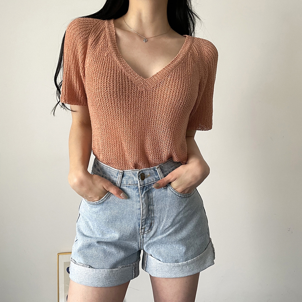 - 브이넥 부클 반팔 니트