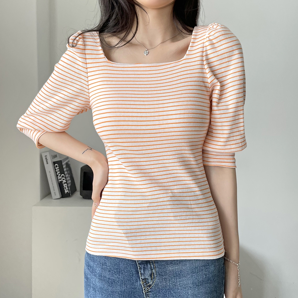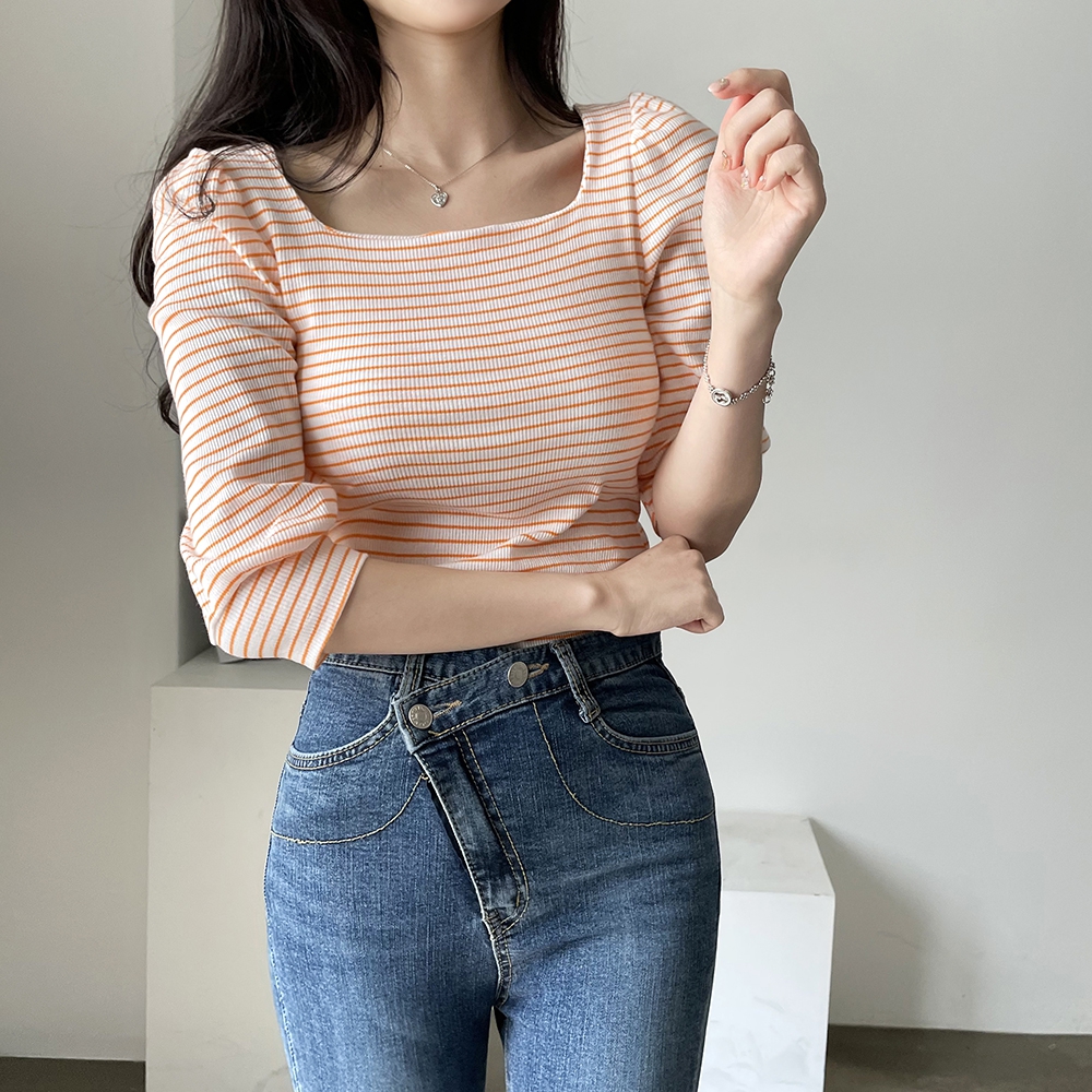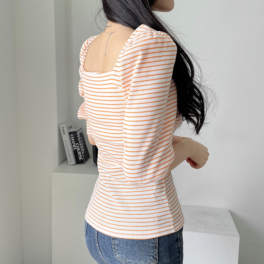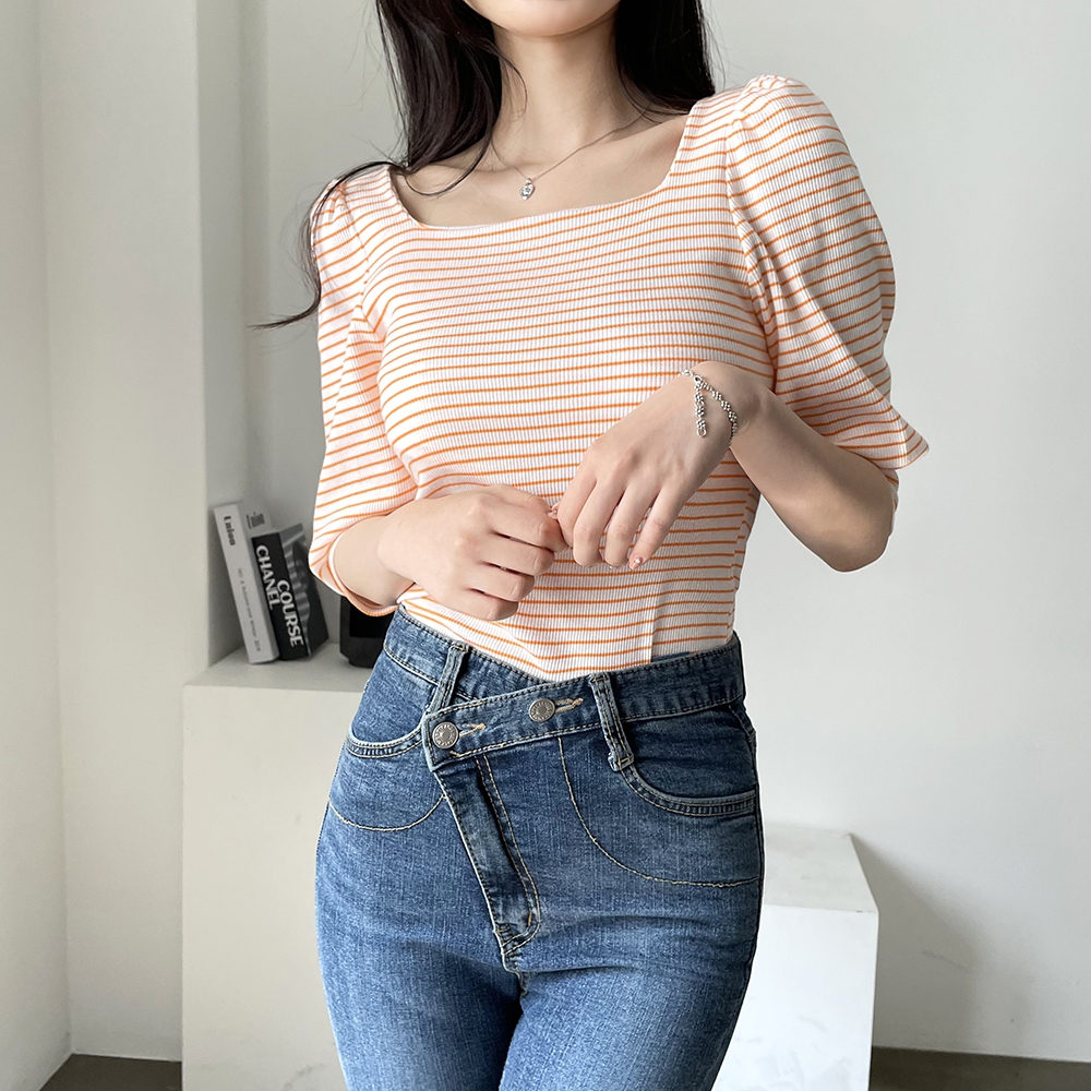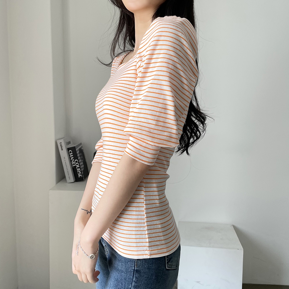 - 스트라이프 스퀘어 골지 티셔츠