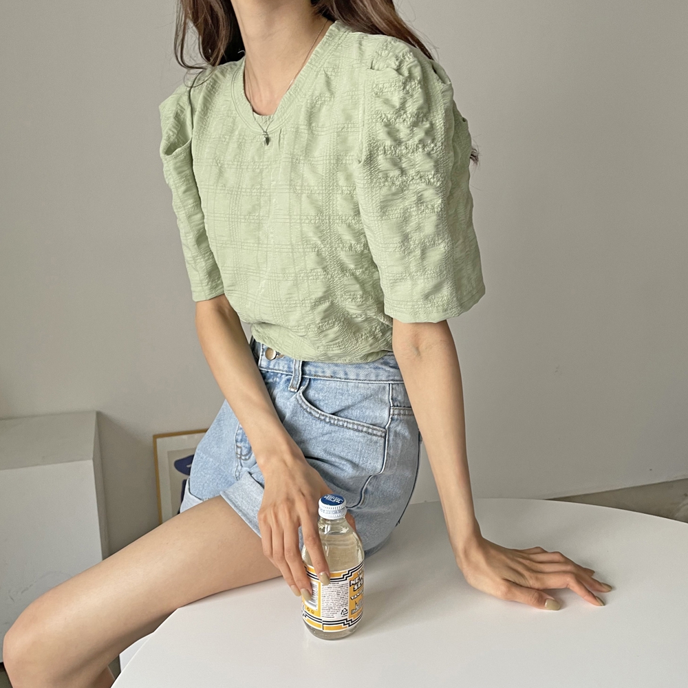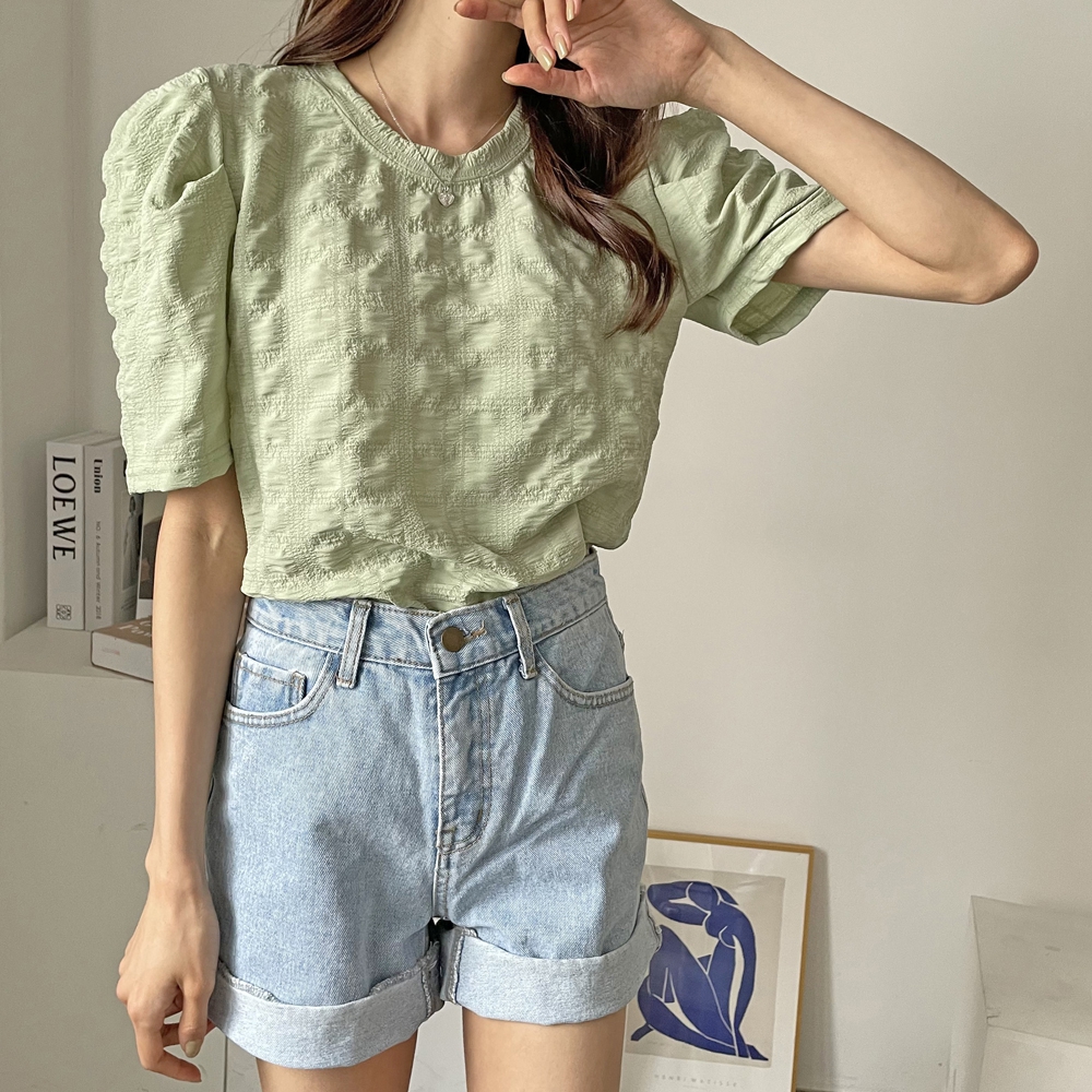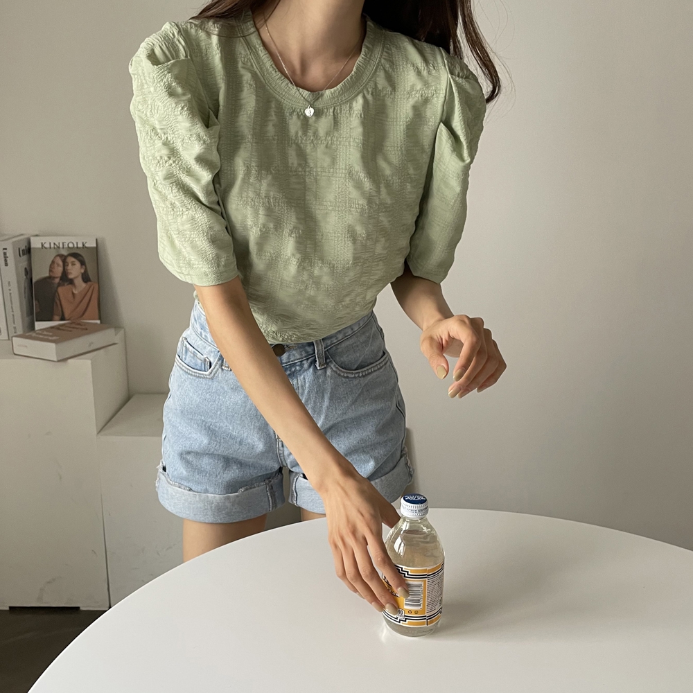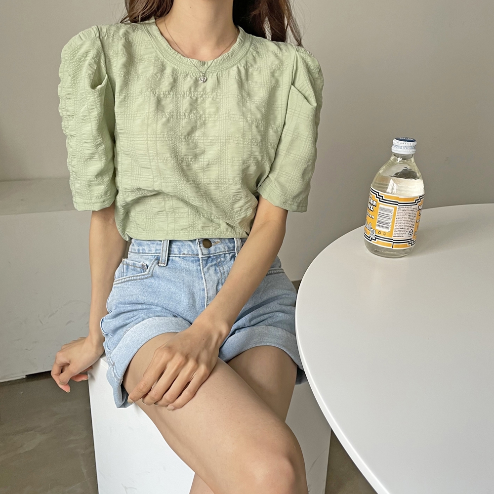 - 라운드 셔링 퍼프 반팔 블라우스