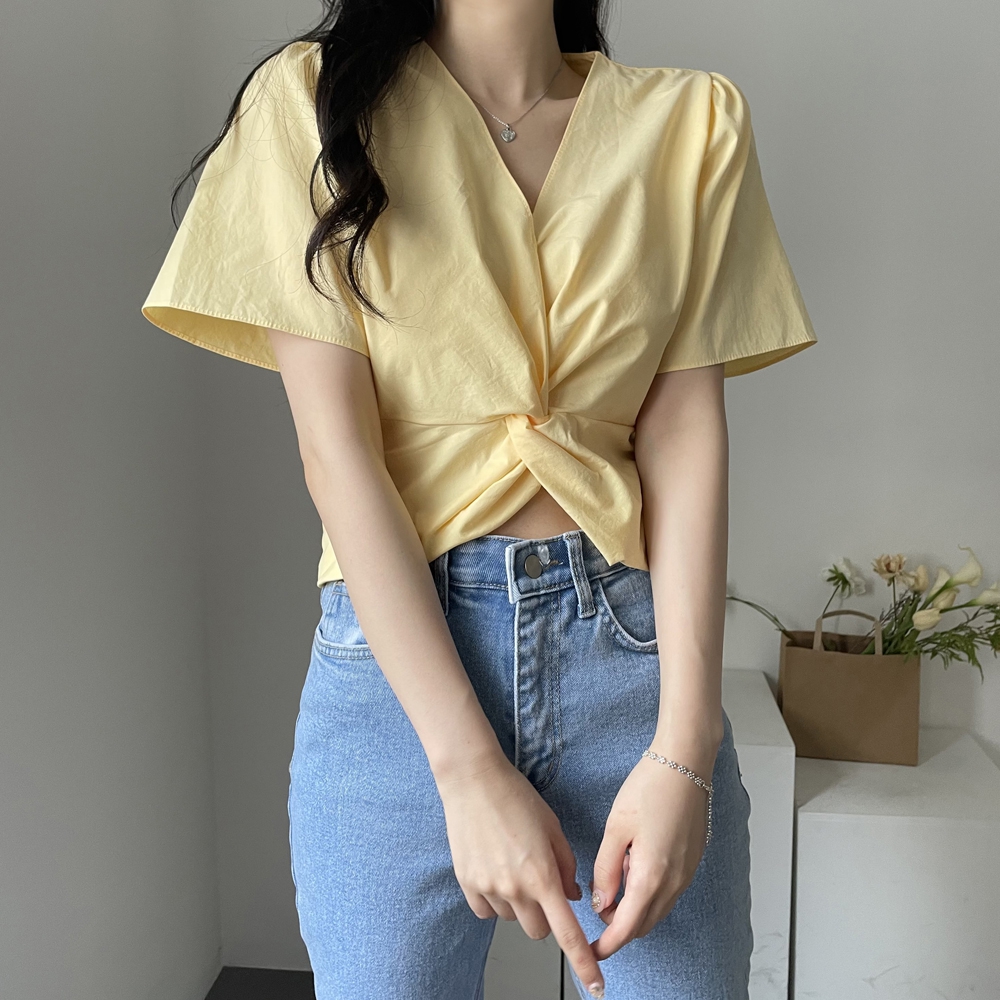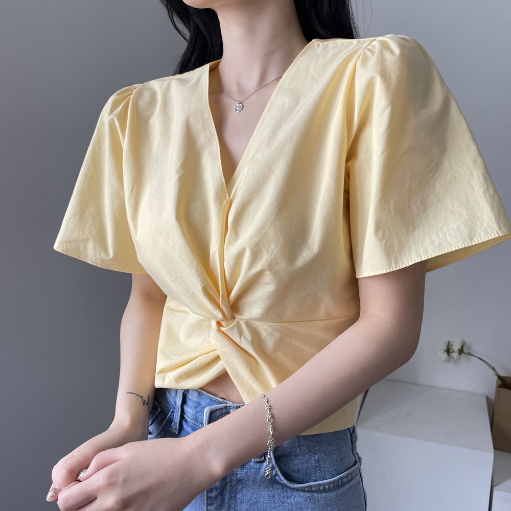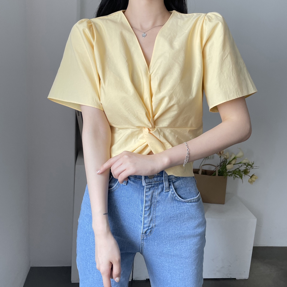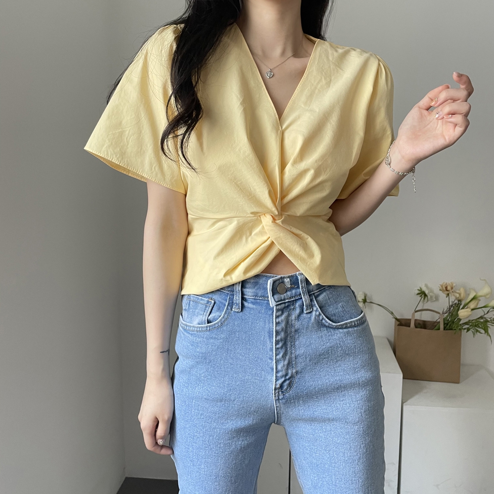 - 브이넥 뒷밴딩 꼬임 반팔 블라우스