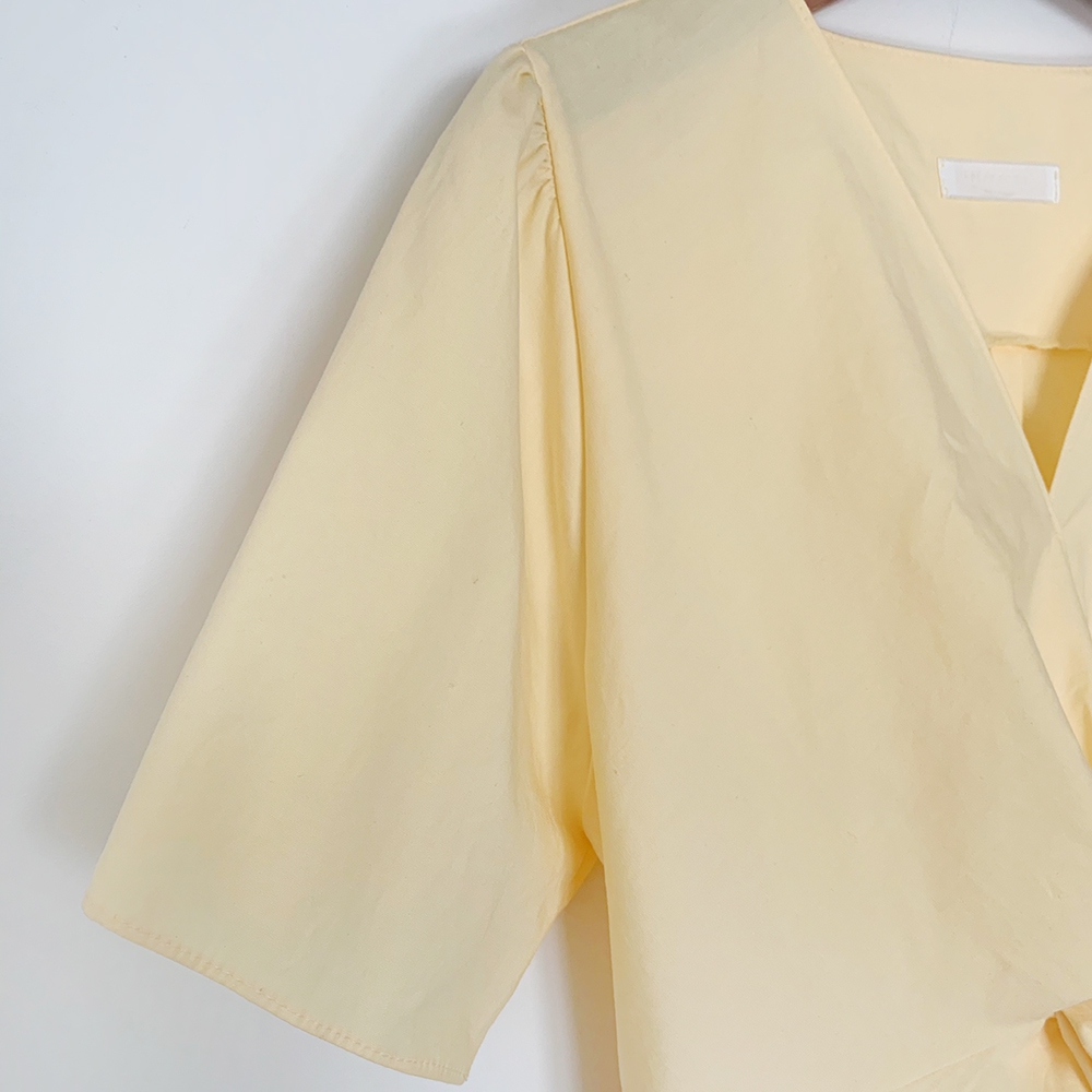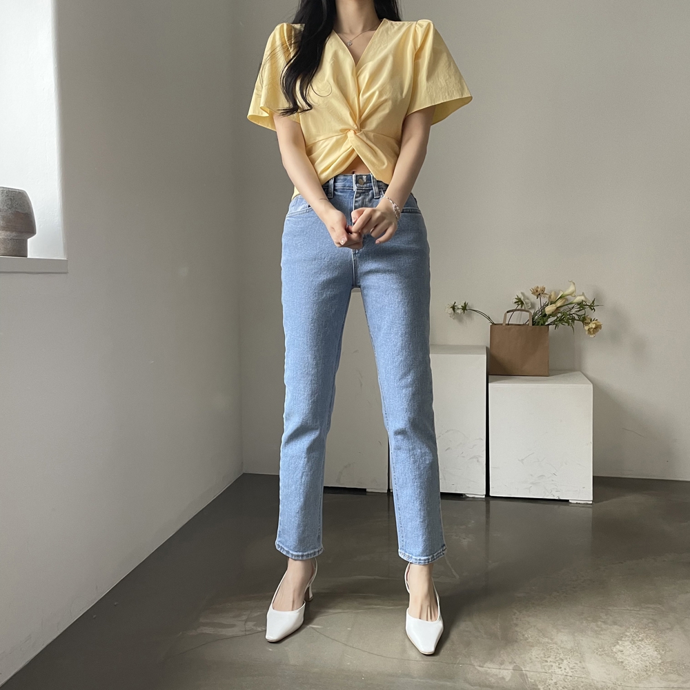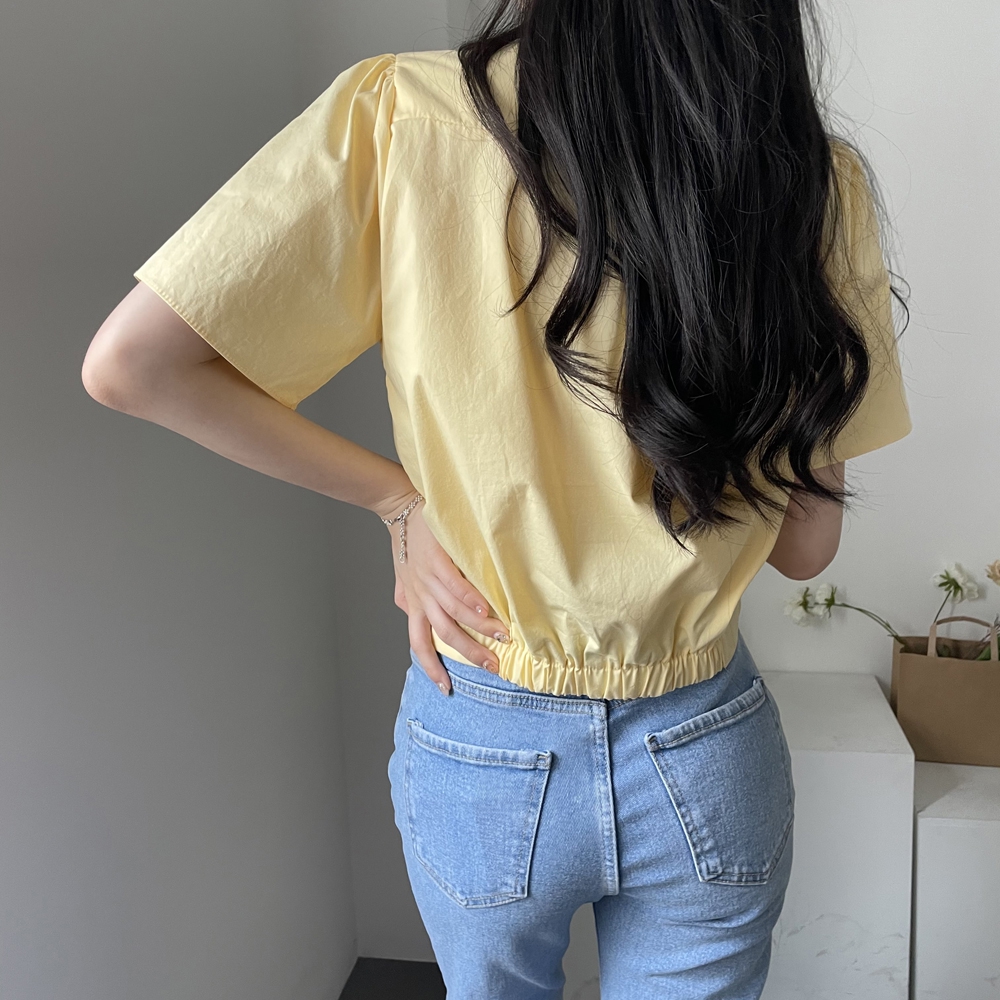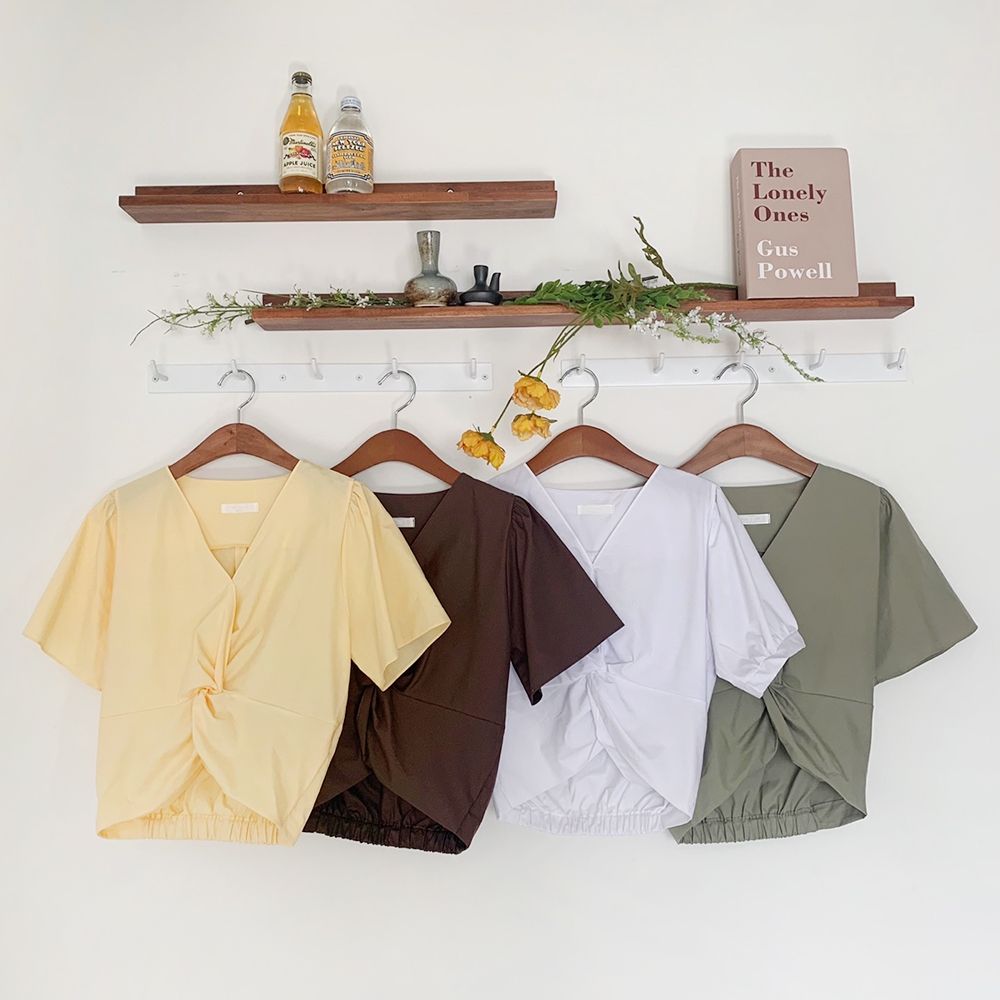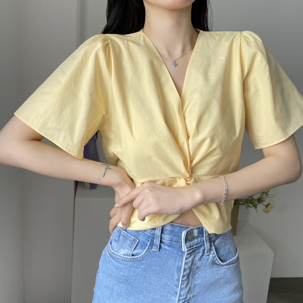 - 브이넥 뒷밴딩 꼬임 반팔 블라우스