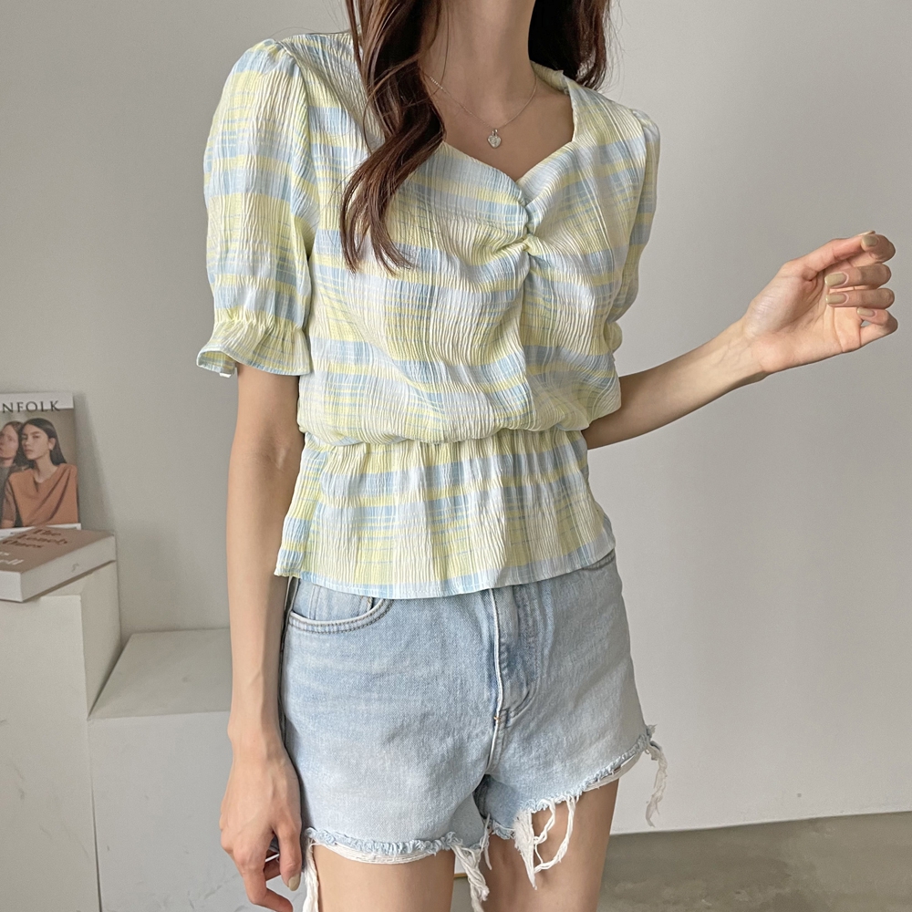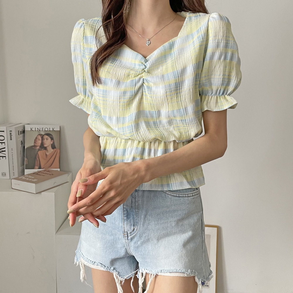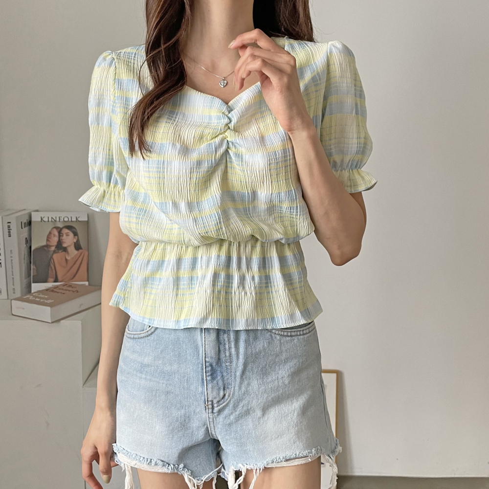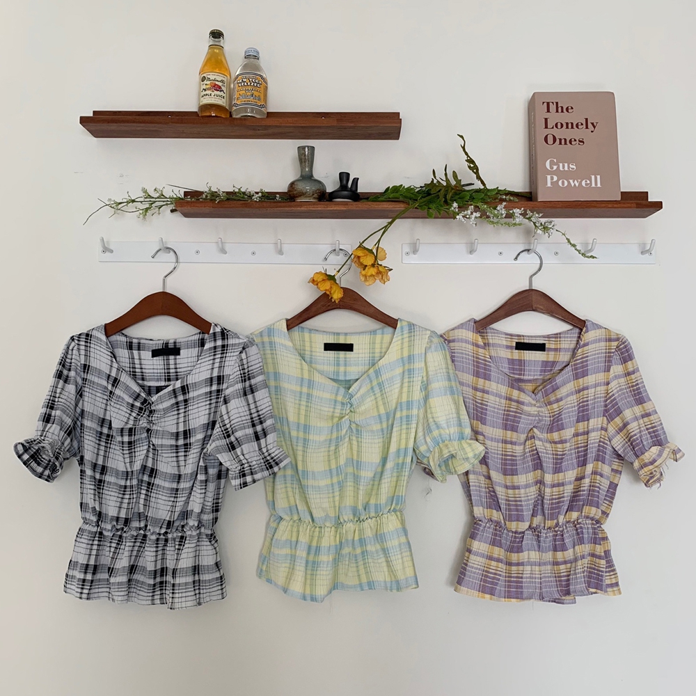 - 체크 셔링 반팔 블라우스