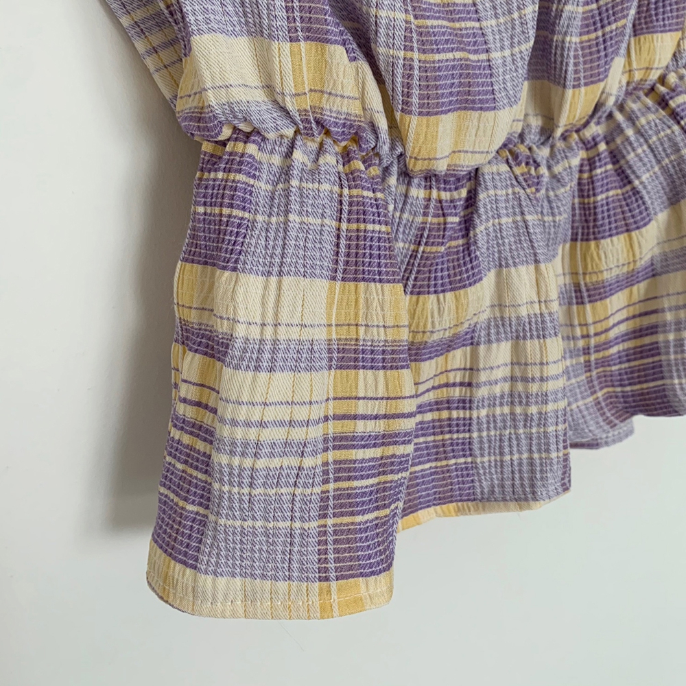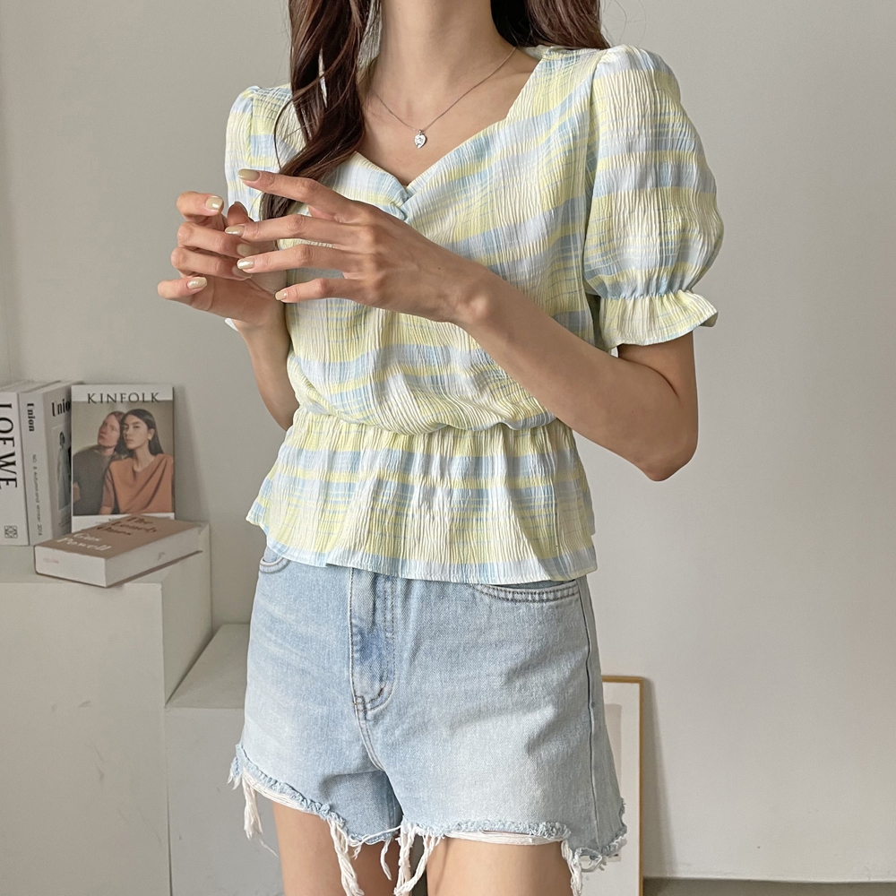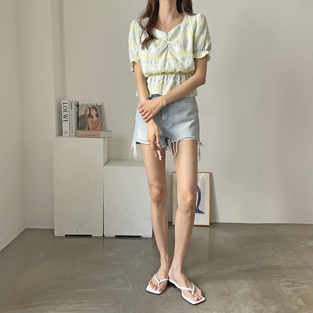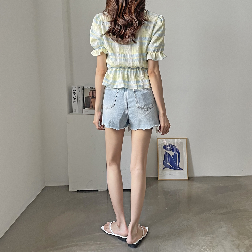 - 체크 셔링 반팔 블라우스