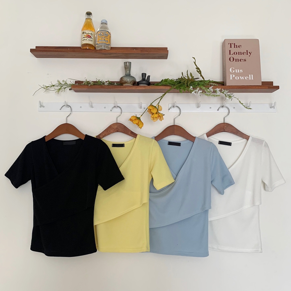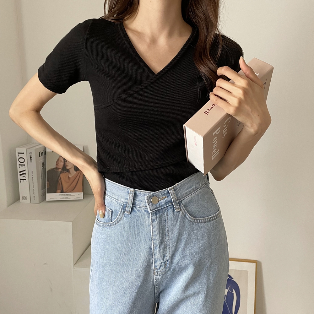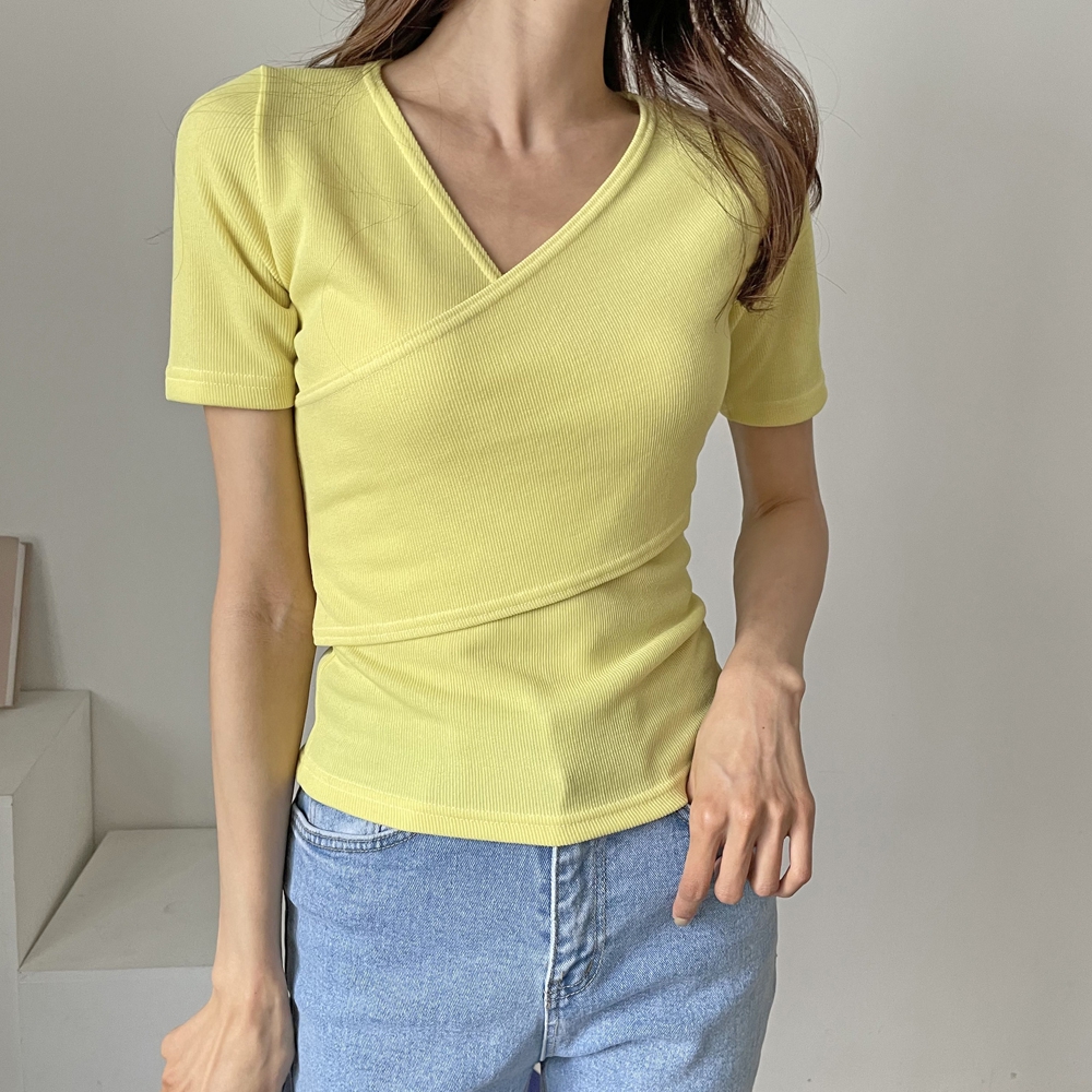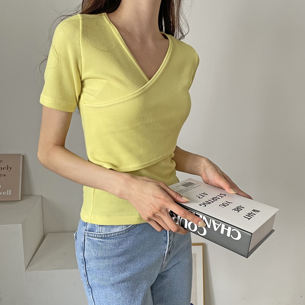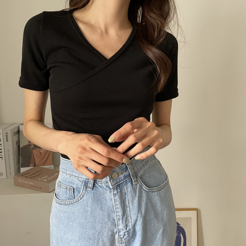 - 브이넥 랩 골지 반팔 티셔츠