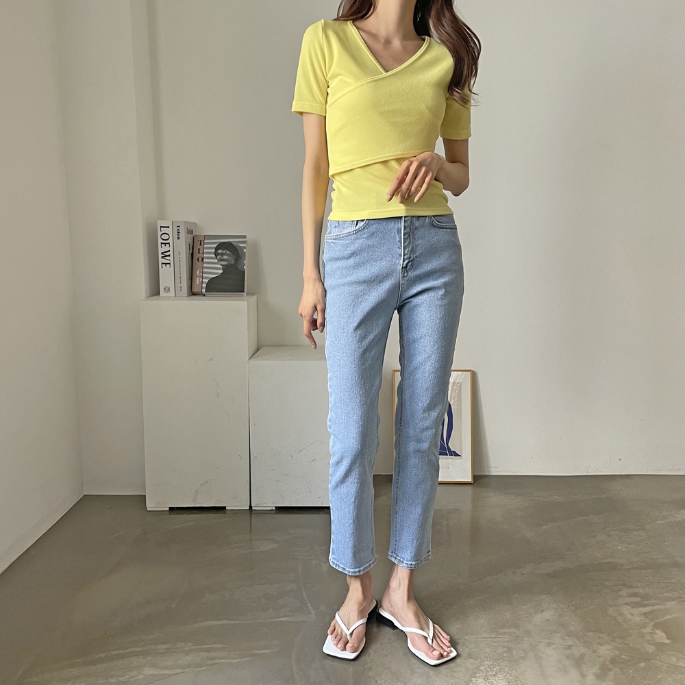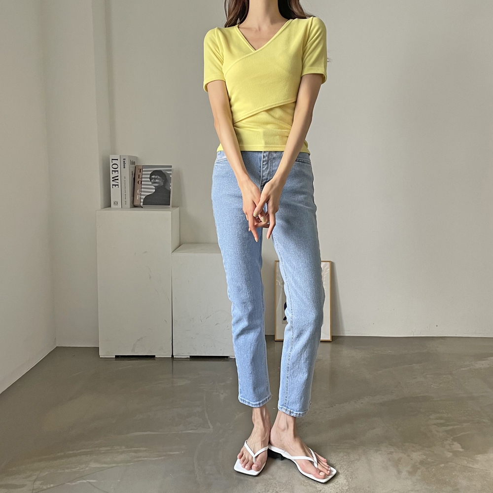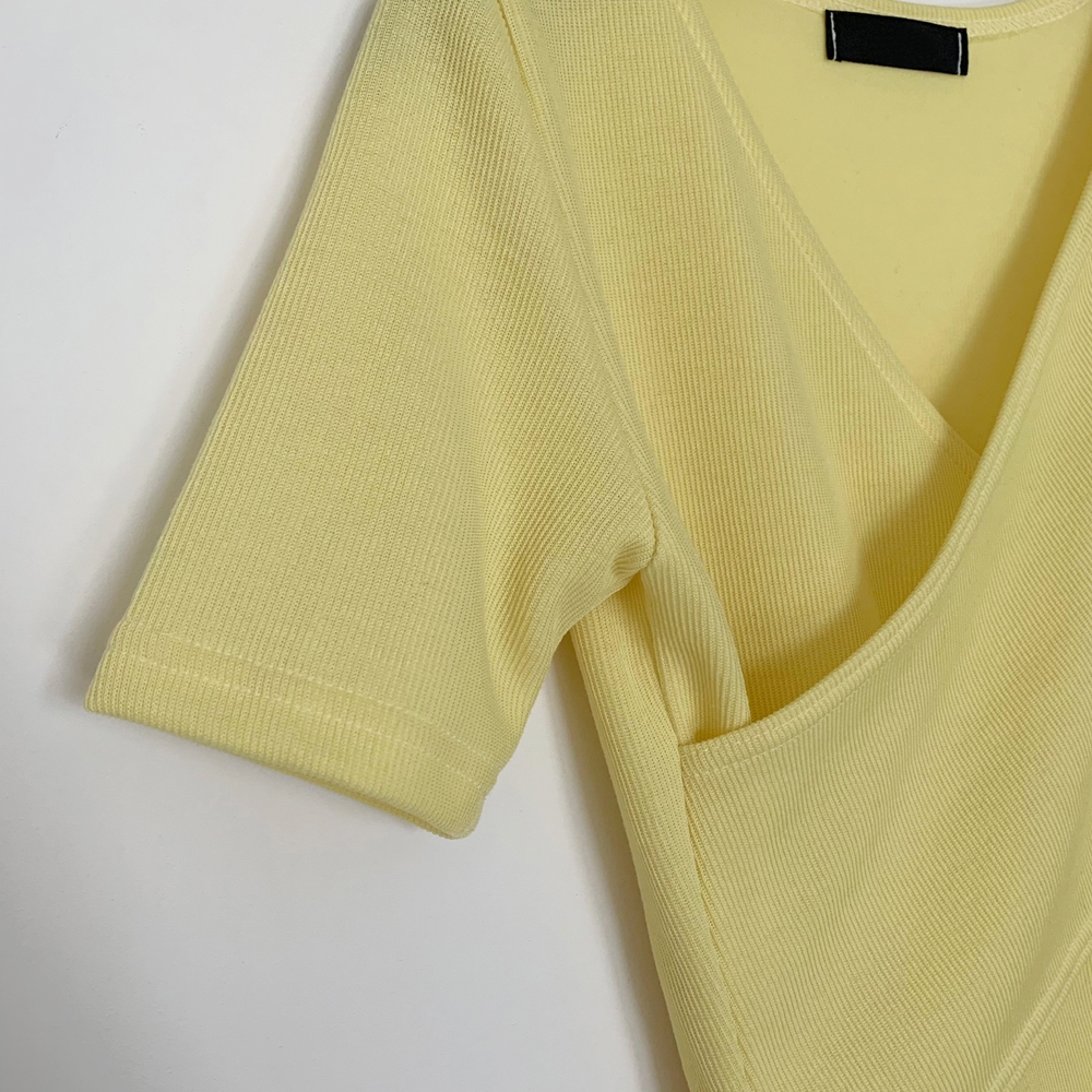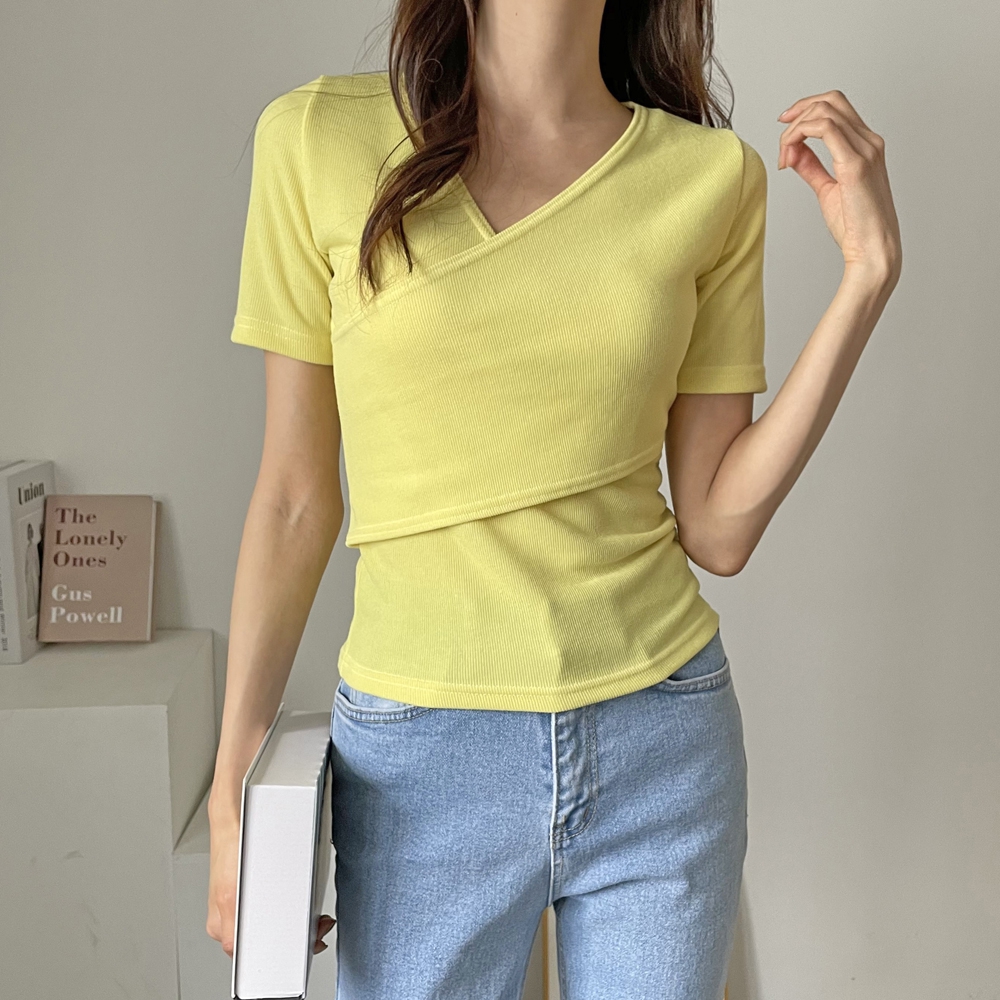 - 브이넥 랩 골지 반팔 티셔츠