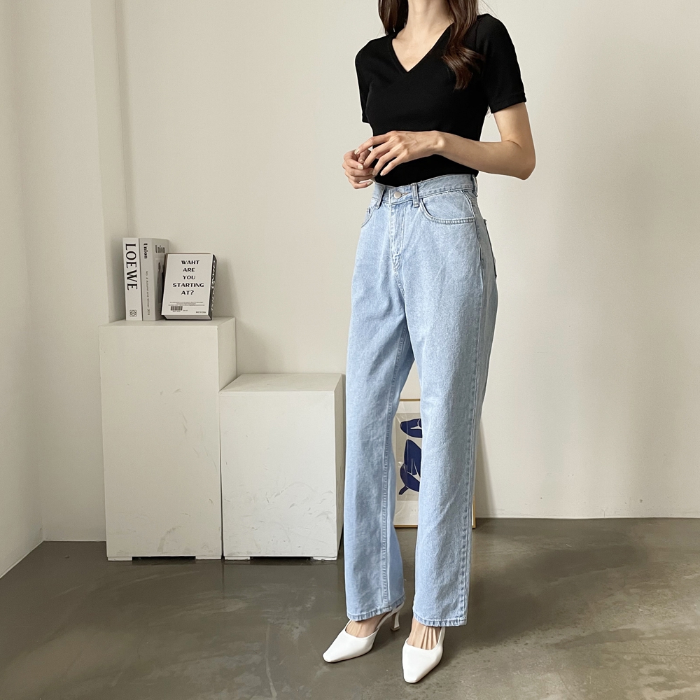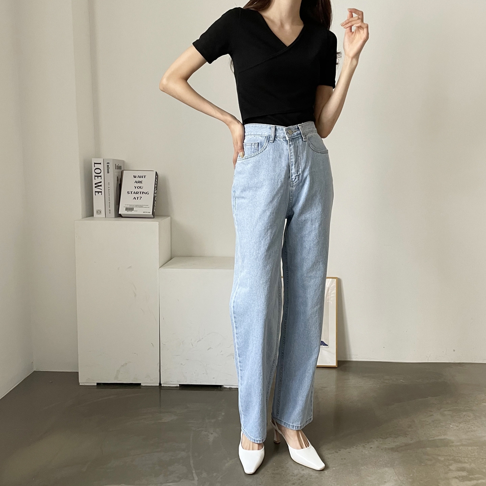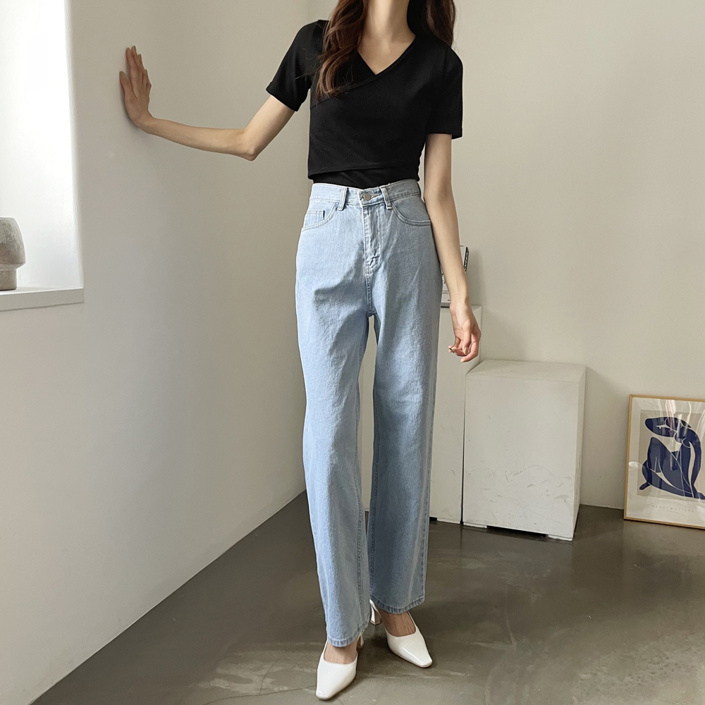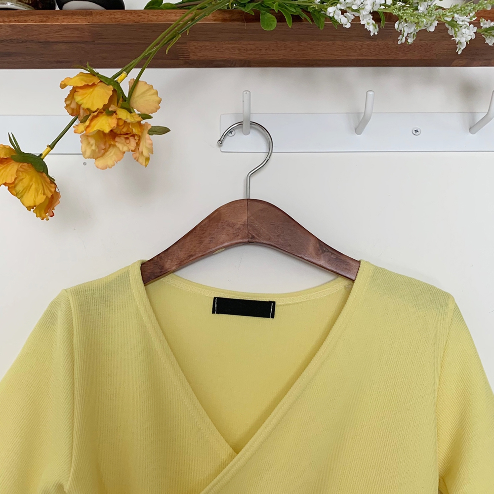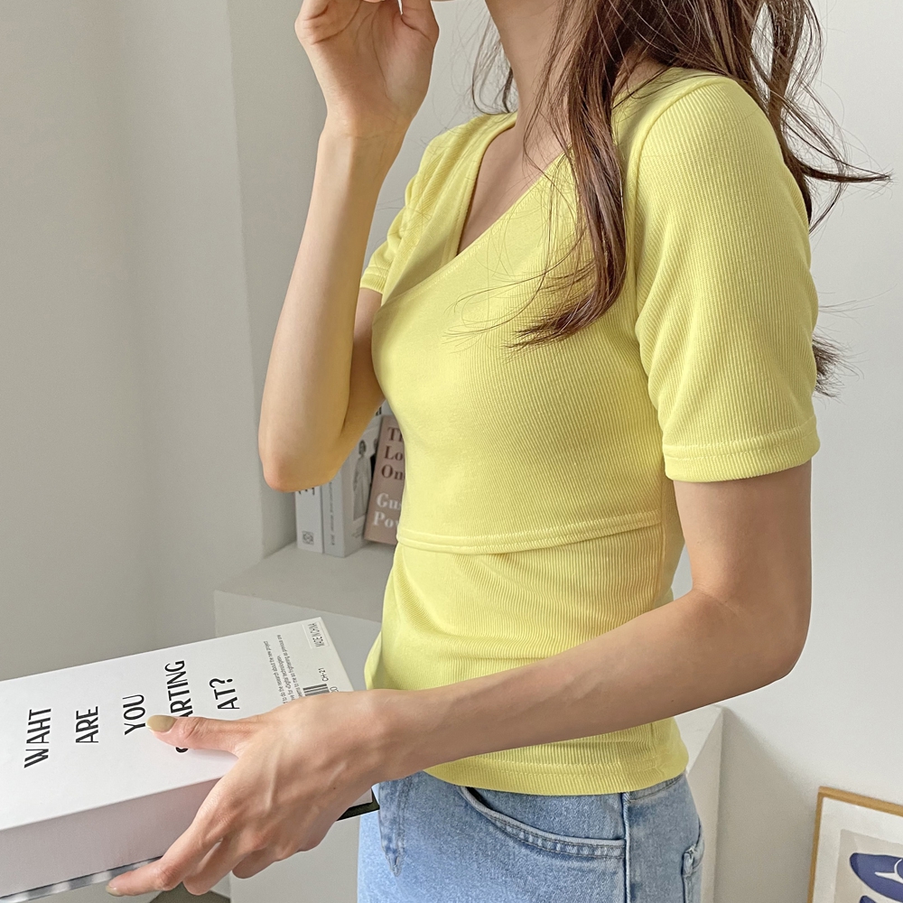- 브이넥 랩 골지 반팔 티셔츠